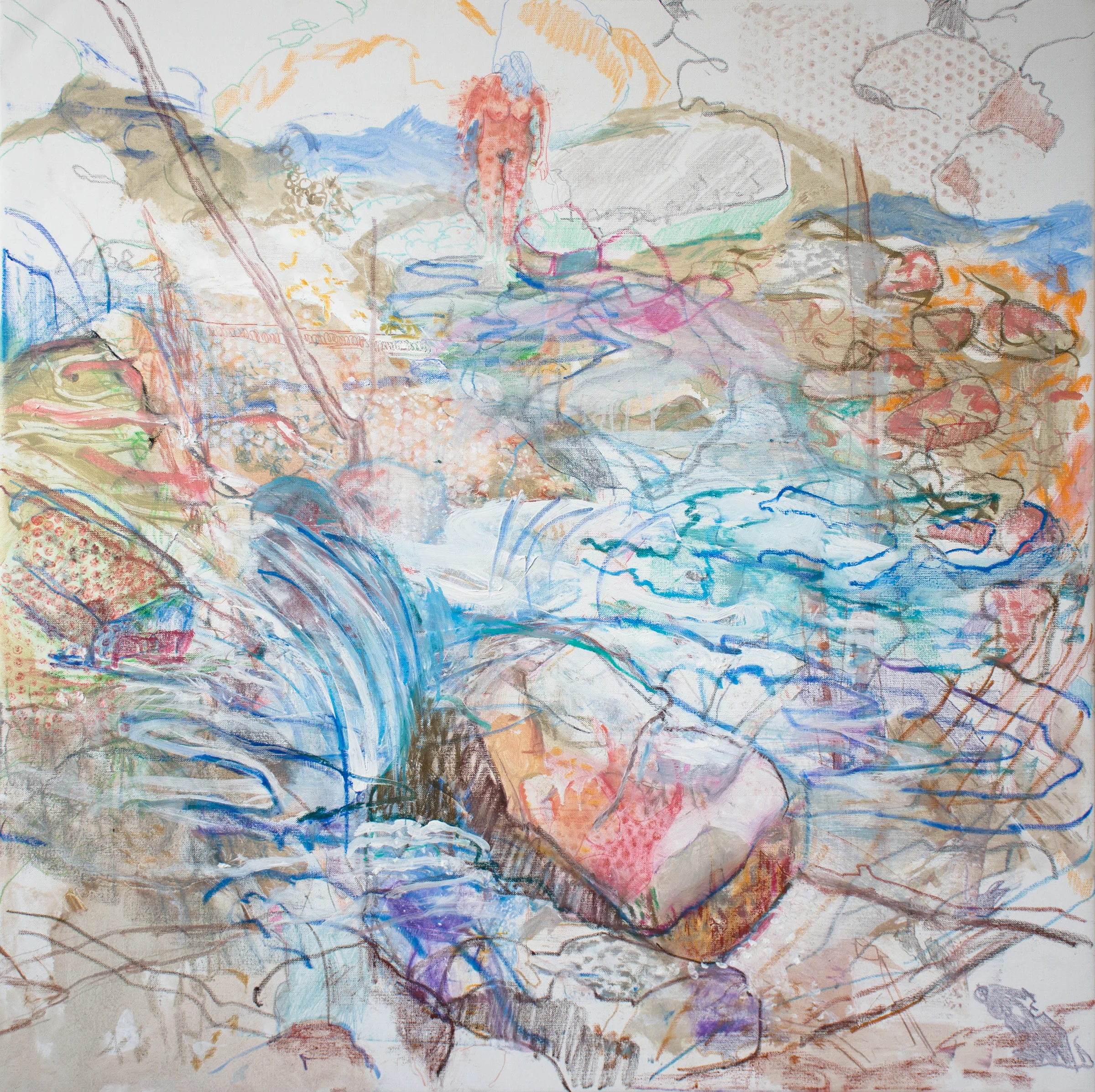12:48 PM: after having motion 30 hanging in the house for 24 hours i spotted and area on the left that was a "dead spot," & noticed that the central rock form was a bit too dominant, so i worked on it, made a few other updates, photographed it and, when i saw the images of yetsredays and todays version side by side on the screen, it was clear i had done too much. so back it went on my easel, and here's the current state. comparative views of yesterday & todays versions are below with the current state on the right.