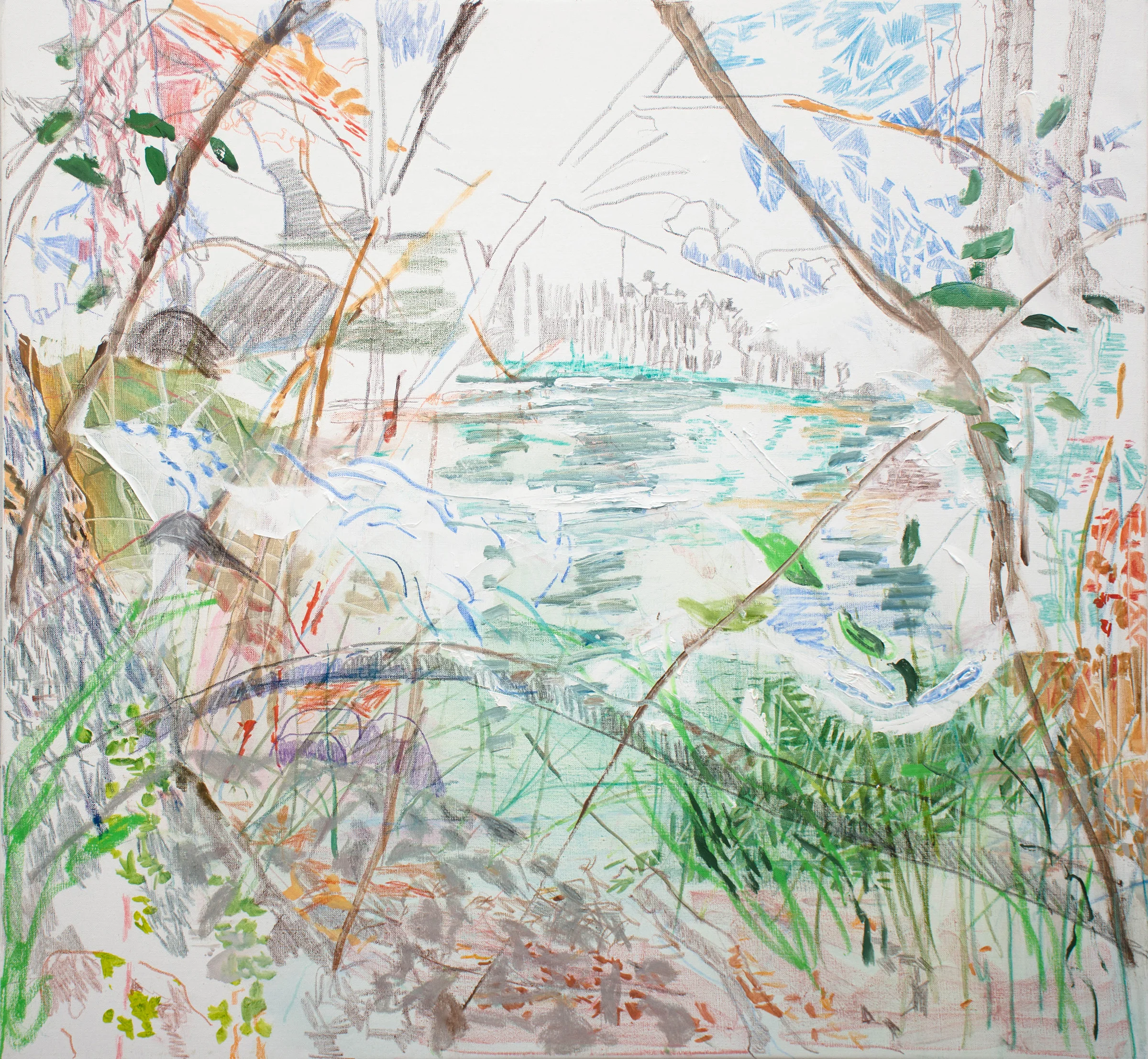 so this morning i literally grabbed the failed, or so i thought motion 27 and dove into it, placing it flat on my work table & applying scoops of titanium zinc white with palette knives. my expressionist self came to life as i swirled the paint into shapes mimicking the roiling creek water, then scraped, then made bold tree branch marks with brushes, again scraping while delighting in my WTF attitude.