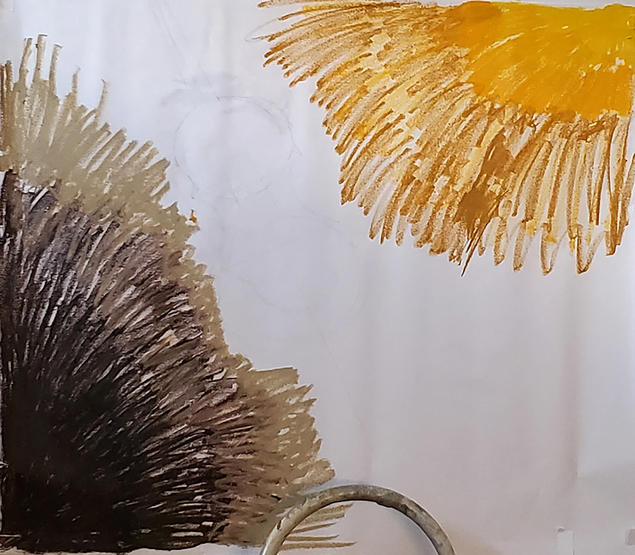 7:21 PM: today my mentee, k., arrived at 4pm. i prepared a large piece of paper for him to work on, and provided a book about the mergence of Cubism, with images of the work of picasso & braque.he chose to use the image of a cello, which cannot yet be seen in this photograph of the drawing/painting at the end of the day..