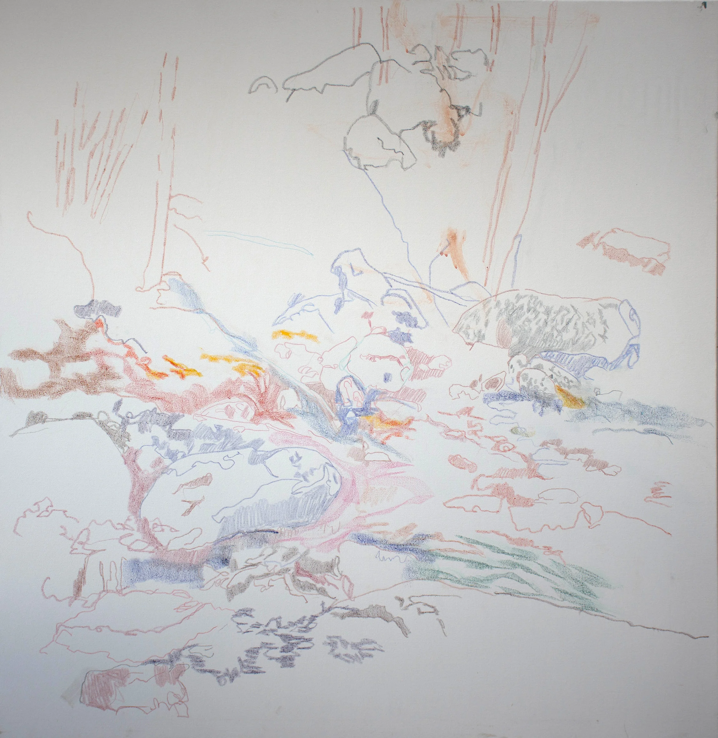 so today i worke don 3 paintings, which you see on my studio wall.2 of the 3 are BELOW. the on eon the left is 42 x 38” and is at the early stages of drawing. on the right, 38 x 36” is a many layered painting which, i think is finding it’s identity. it was a little wierd getting back to work so quickly after a week away. the closer it got to 4 pm, when my mentee was to arrive, the more i got into my groove. it seems, as i told k., that his presence is an inspiration.as you might gather from the image below of what he did today, he’s very good.