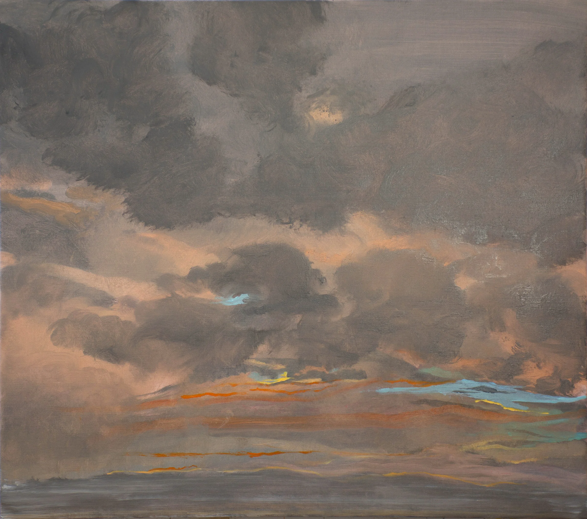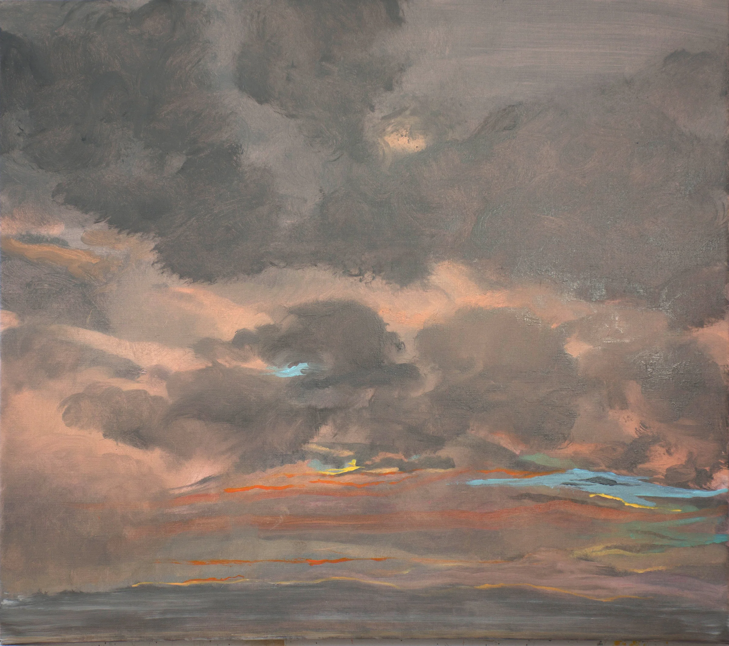 in yesterdays version, on the LOWER LEFT, while the basic bones of the painting are there, the trasitions from cloud to sky and from darker cloud to lighter, are too abrupt, and the blue too strong and too much of a contrast. as a result, the eye gets stuck on, for example, that central blue & the dark grey, almost black next to it. now, as i gaze at the painting on my studio wall, the new, subtler transitions allow the eye to roam unimpeded. as a result, the mood of this painting comes through, and the eye wanders freely, now able to appreciate the warm magic of this moment in time: 8/24/17 7:34PM, and the painterliness with which it is rendered.