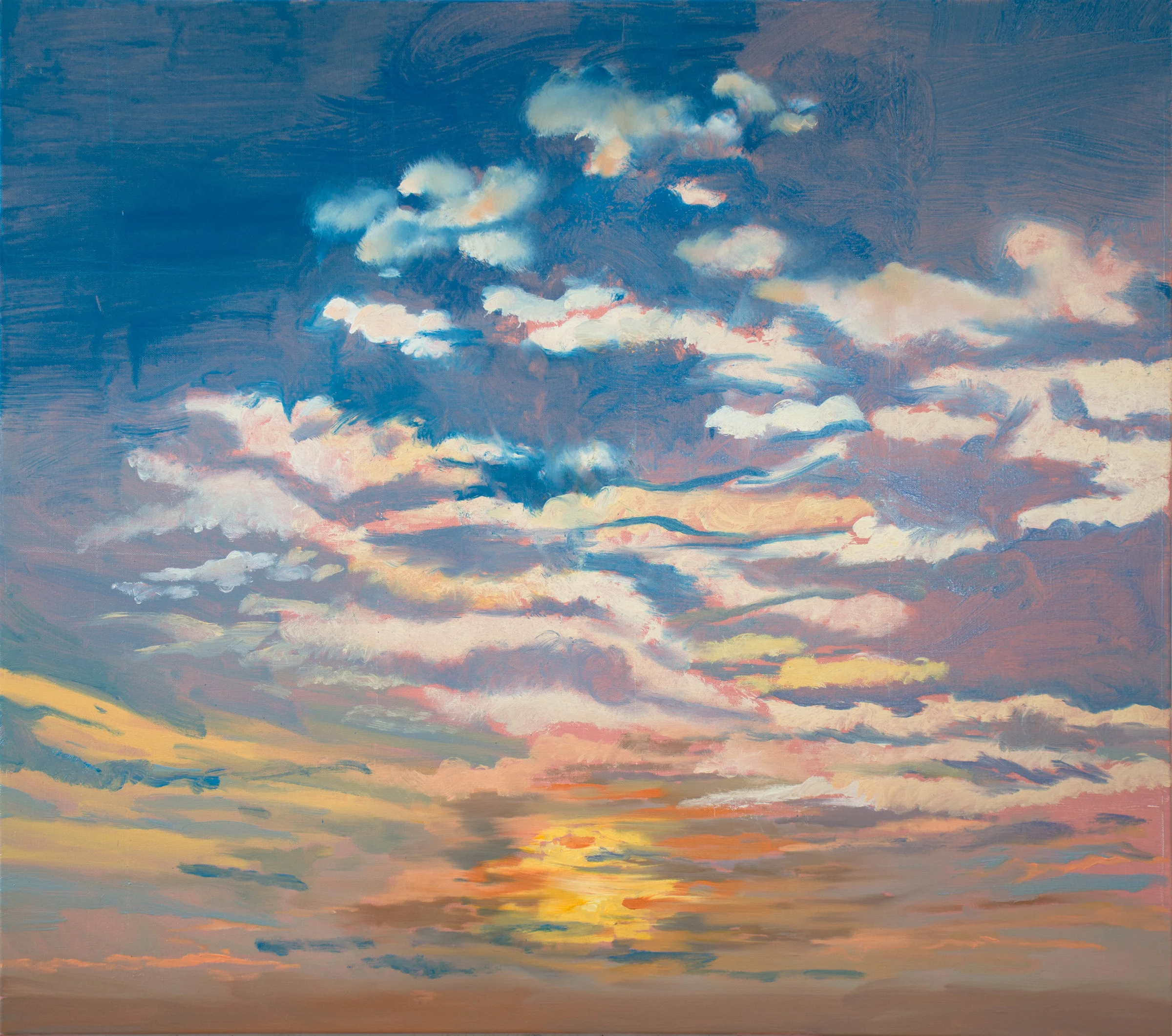 so i made extensive changes to the new 1/1/19, 4:21pm (32x36”}, which i began work on yesterday. i found that the cloud shapes occupying the upper 2/3 of the painting, while they may have worked as abstract patterns, were not at all in harmony with the treatment of the sunset at the bottom of the painting. so i did my usual scraping and schmearing, then painting into it, repeating, until i got it resolved…i think.