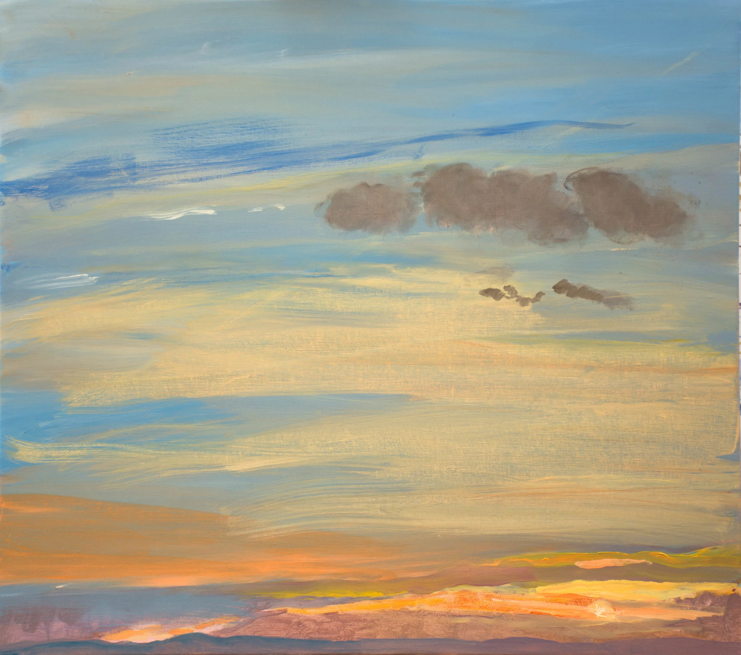 as for 8/24/17, 7:38pm, i felt that the transition from the orange/yellow sunset sky to the blue sky was too abrupt, and in effect, created the impression of 2 distinct, sort of but entirely related, paintings. as with 1/1/19, 4:21pm, i did a lot of scraping & dragging a fully loaded brush, scraping again and so on. it seems to me i definitely resolved the issue of the perceived split between upper & lower portions but, as with almost all the changes i make to paintings, i can’t get a good read until the following day.