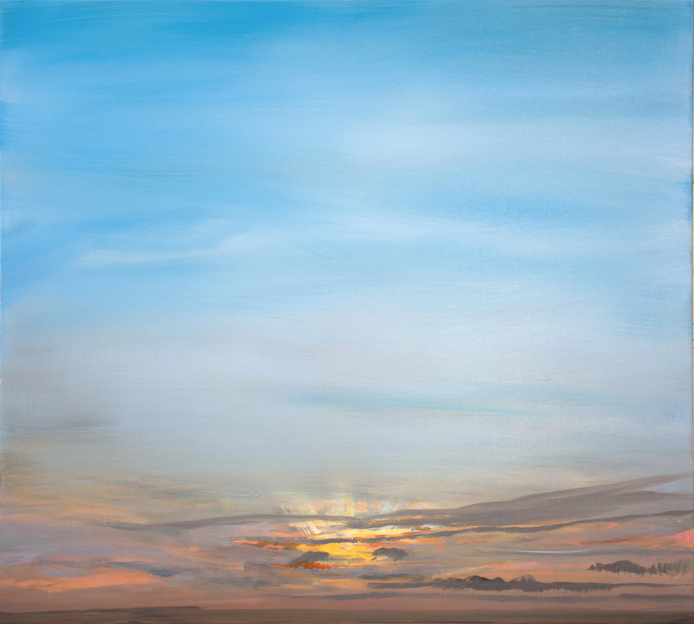 2:07 PM: after skipping a day in the studio due to dental appointments mikela & i had, i returned with a fresh eye. 1/1/19, 4:21pm seemed to busy in the upper 2/3, so i painted over all those candy colored clouds, allowing the eye to relax & enjoy the sunset. i studied yesterdays sunset as we returned from salida, both to the west and to the east.those final 15 minutes tell the entire story, and what i noticed more than ever before were the subtleties of the transitions. those observations along with a great conversation i had yesterday morning with harwood, one of my dear friends at gremillion & co. fine art in houston, precipitated the changes that occurred today. tomorrow, i’ll tackle 8/24/17, 7:38pm.