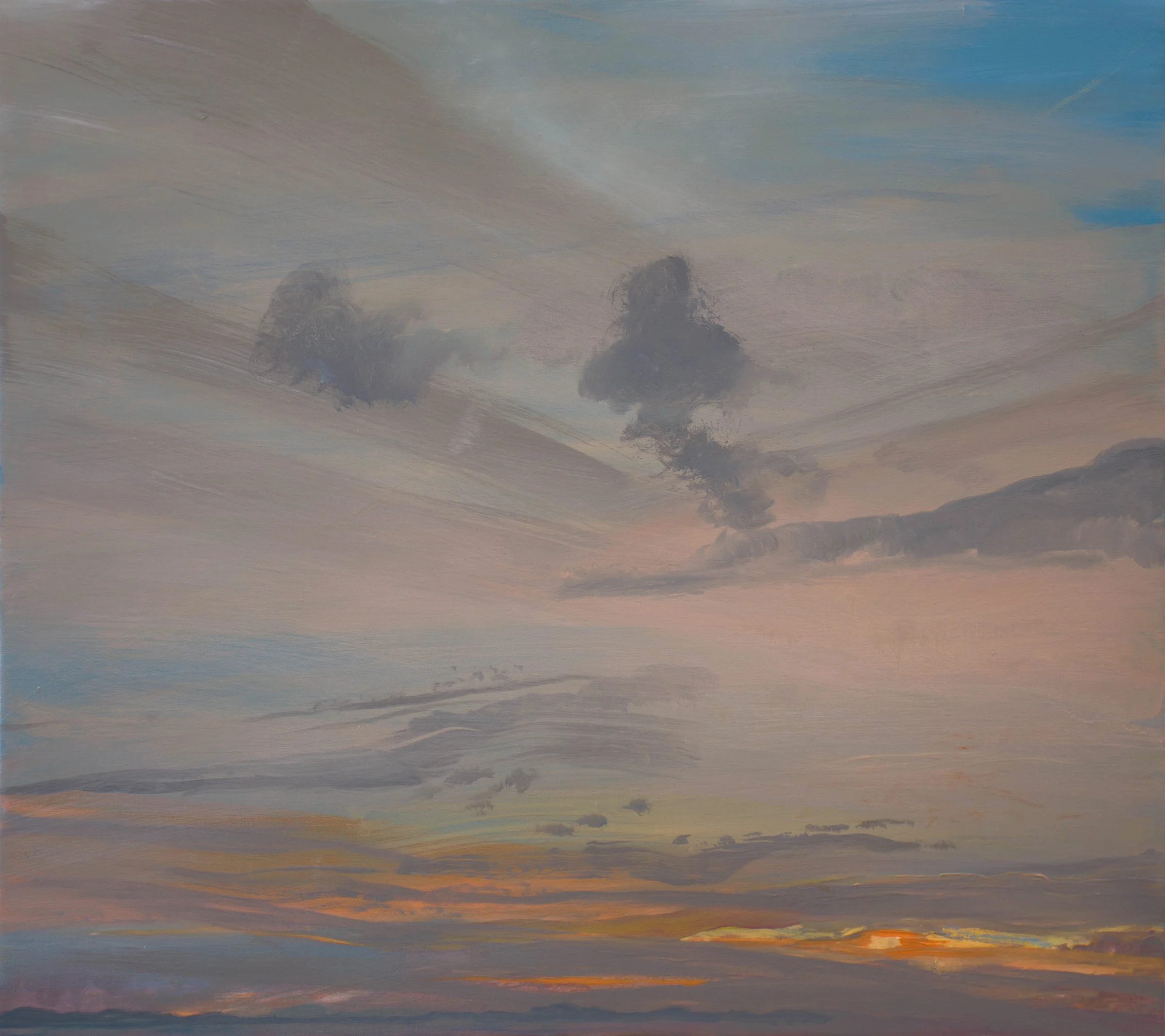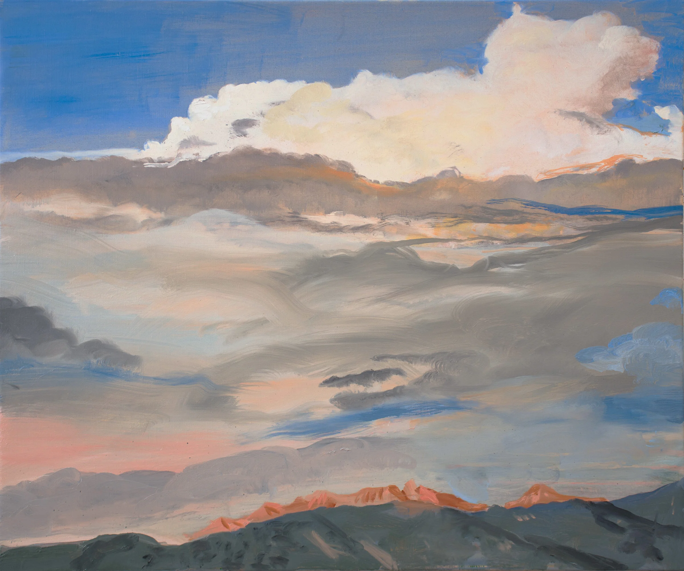6:39 PM:the 3 sky paintings BELOW were revised today. i rotated, going from one to the other, using the same palette. about half way through i had to put out a second palette. it was like nothing i’ve ever done; like keeping 3 plates spinning. discoveries i made in one spilled over to the other two, and as a result there is a strong relationship between these paintings. i’m learning evrey day, studying the sky as we take our walks up to the stupa; as we drive home on our travels and as i gaze, every morning and evening form our windows out over the slv and at the peaks of the sangres.