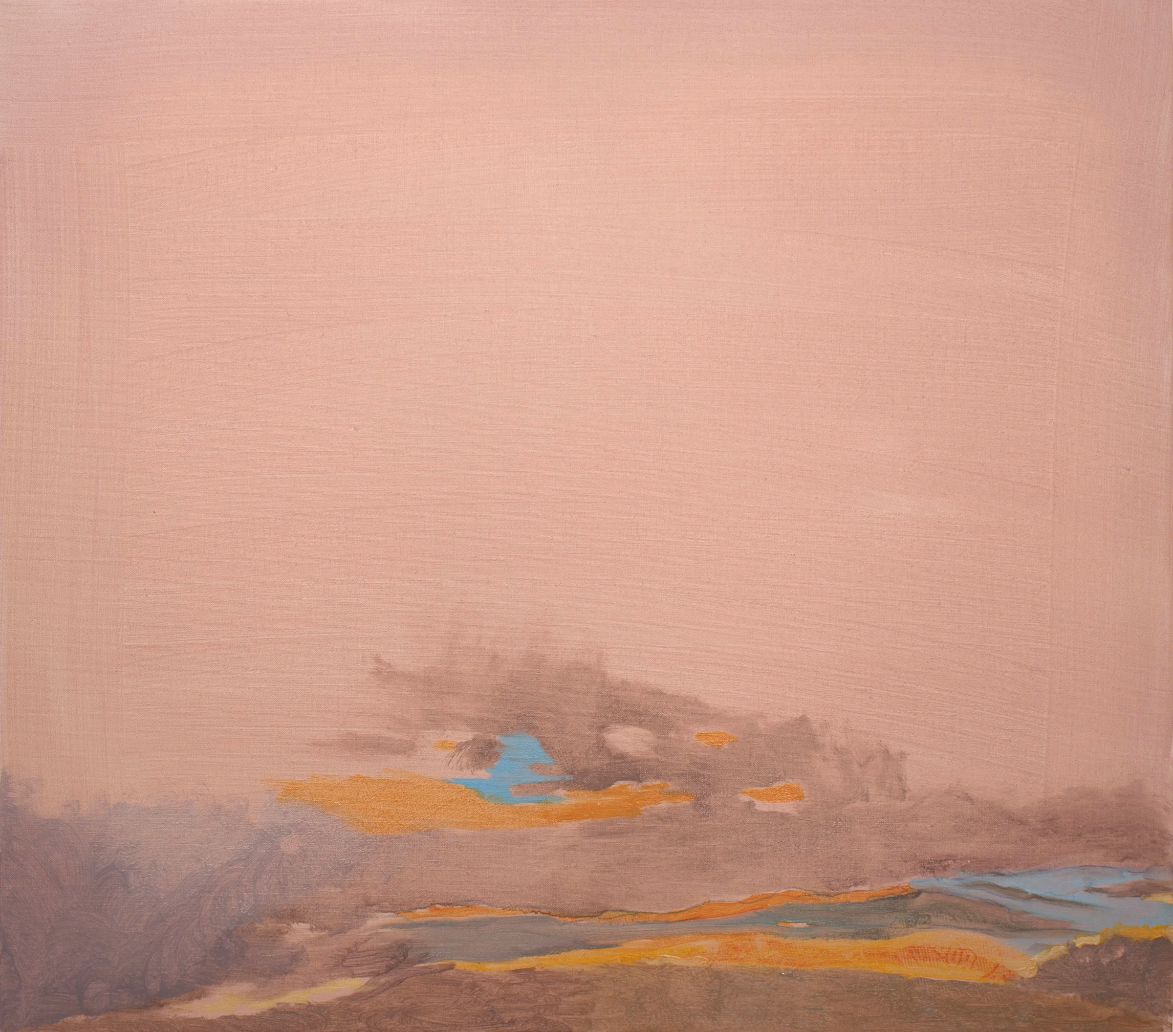 then i started work on a painting based upon a photo i shot just 4 minutes later: 8/24/17 7:38PM. it, too, is being painted in oil on a tinted ground, which has the exact same color as the acrylic ground underlying 8/24/17 7:34PM. i’m going about this one differently, starting work on the bottom of the canvas rather than the top. at the moment, this gives the interesting illusion of a sky above the sky. (BELOW)