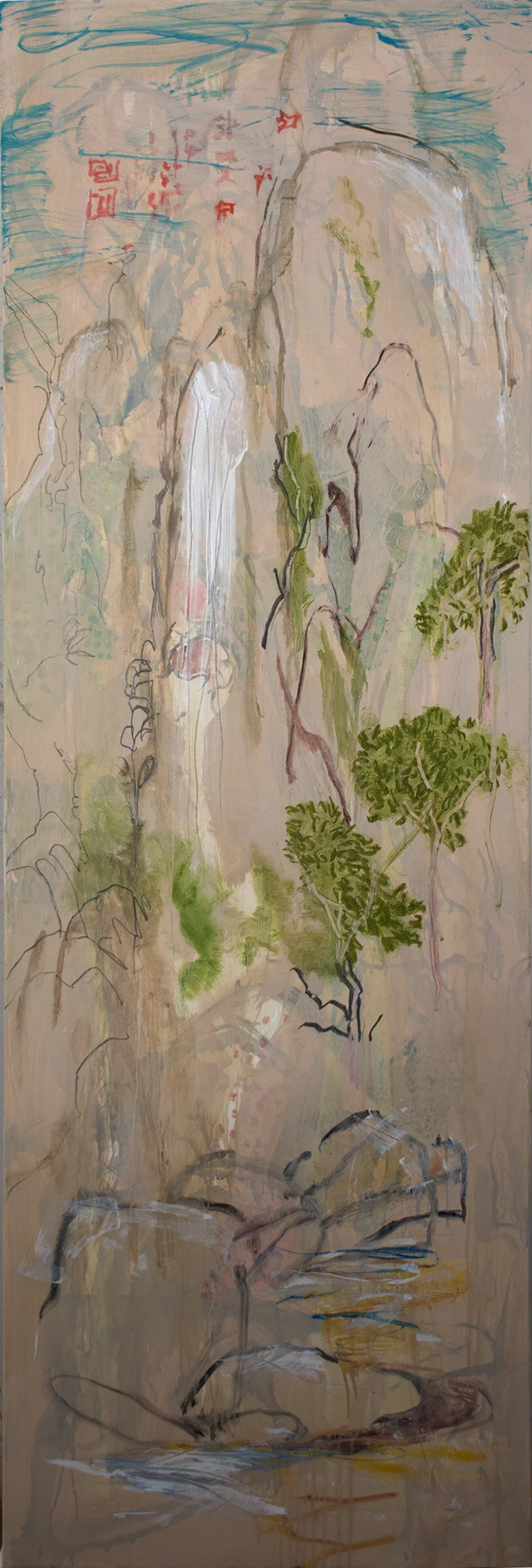 1:10 pm: yesterday, after studying minoo for a few days following my last intervention on October 2, I felt that the central portion of the composition needed wore work. so I made the changes you see ABOVE in the comparative before (left) & after photos. I think the addition of the waterfall on the upper left helps focus the eye, as do the trees.