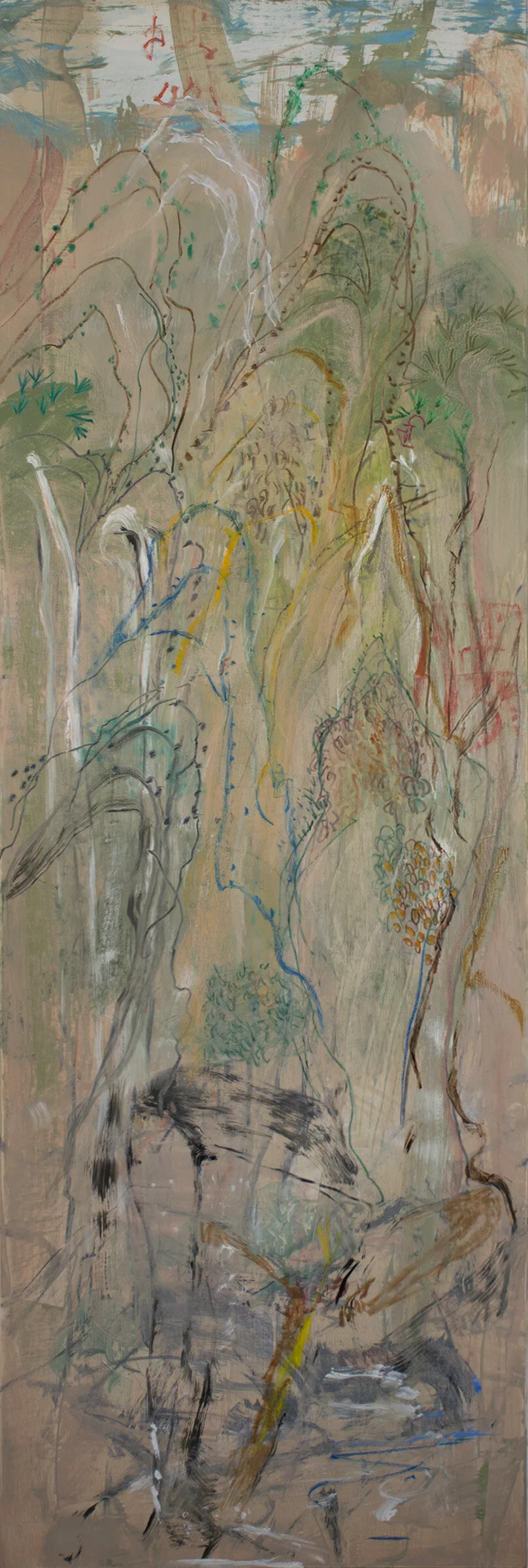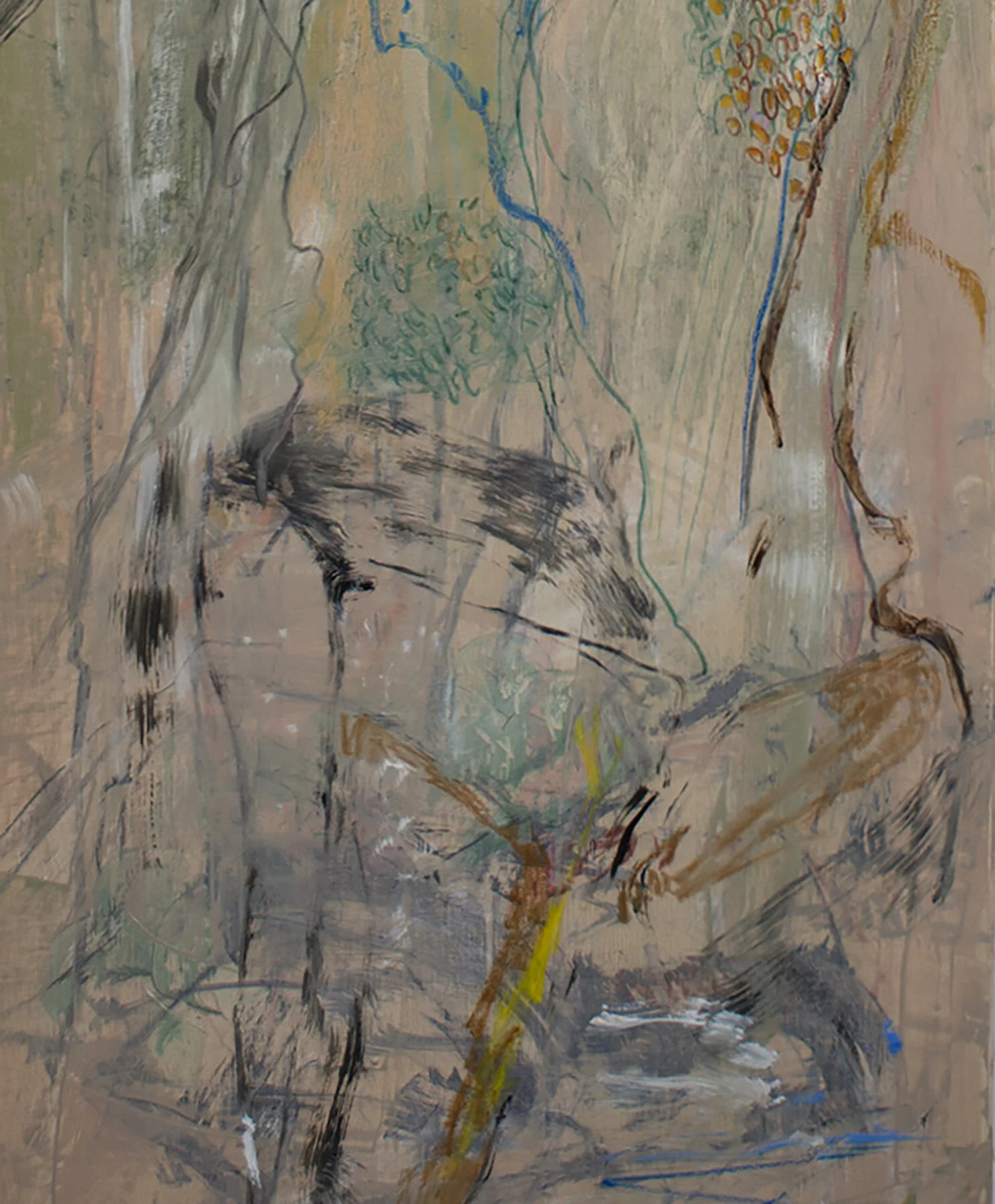 3:57 PM: following our Denver trip, I was able to get back to work on sparse reflections, which I last worked on this past tuesday. my work was interrupted by logistics that needed to be taken care of. sometimes these interruptions work in my favor, resulting in quick darts in & out. I get a hit, pick up an oil pastel crayon, for example, get deep into it, then have to stop to take a call or deal with the guy from the new propane company we’re using who came to switch out the tanks. at some point Mikela came over & gave me her always useful & spot on feedback. usually I take what she observes & turn it into a very loose roadmap of where I need to go next with a painting. what works, what needs an intervention.