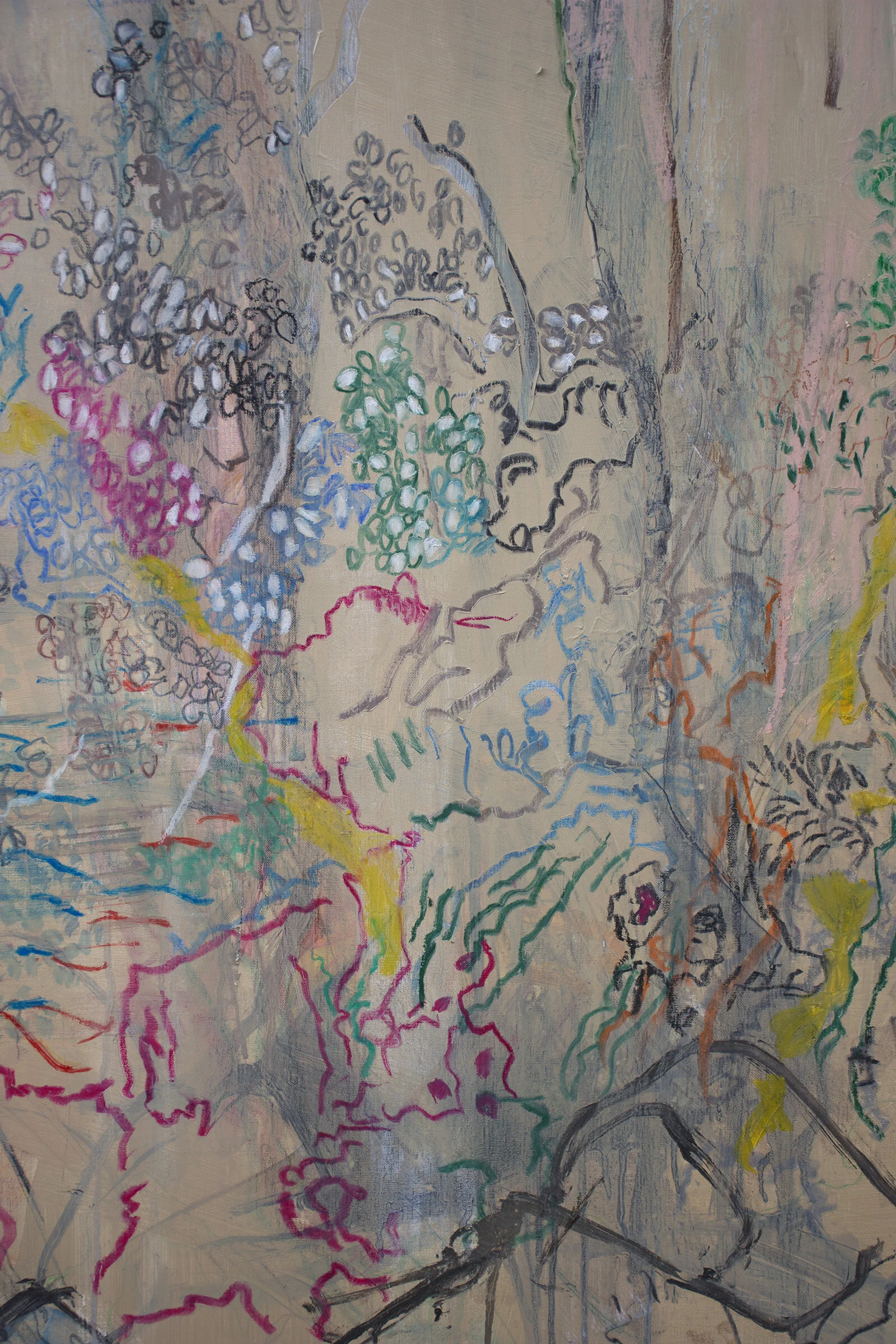 2:20 PM: today I continued my rework of shinkei. there’s more integration between the upper & lower areas of the composition, and the suggestion of a waterfall joining the two. the variety of colors in the marks on the bottom half make more sense to the eye because of a subtle application of pinks & blues in the mountains above.
