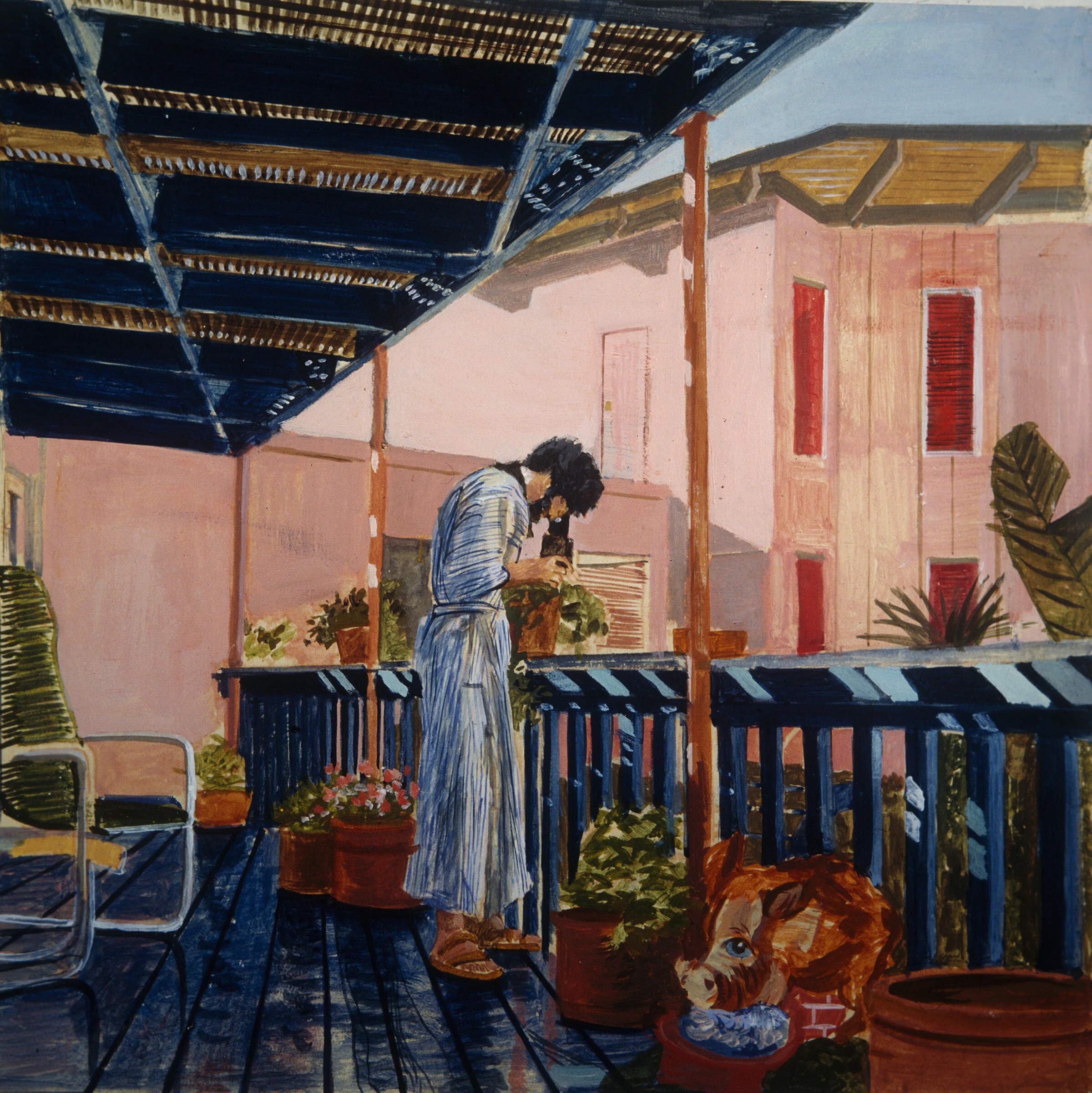 within a little over a year, i would find myself in santa monica, california. my new friend, david hockney who lived up in the hollywood hills, invited me to house sit during his travels. i was still painting in egg tempera when I made this painting, based on a photo I took of myself standing in my robe on david’s deck overlooking his famous pool. this painting was purchased by hockney nd is in his collection.