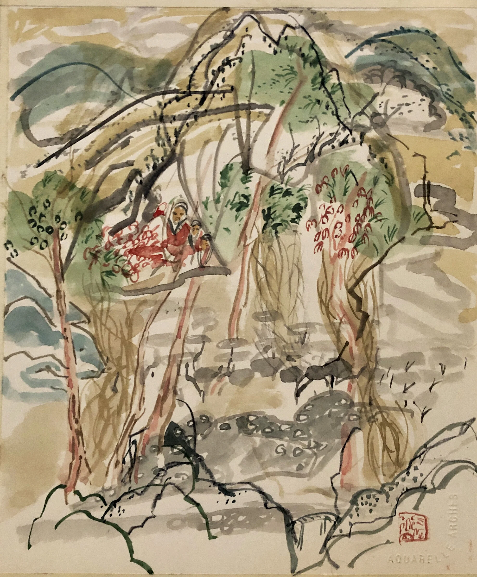 1:01 PM: after being away for 3 days, the first thing I noticed when I glanced at Iil torrent was that it needed some white marks the curves of the mountain shapes. although, following my shoulder MRI, I can’t really paint in a way that requires moving my arm & shoulder energetically, I was able to add the whites using oil stick & a bare minimum of right arm movement. so I think it will remain in this state for a few weeks while my tendonitis heals, and i’ll focus instead on small gouaches.