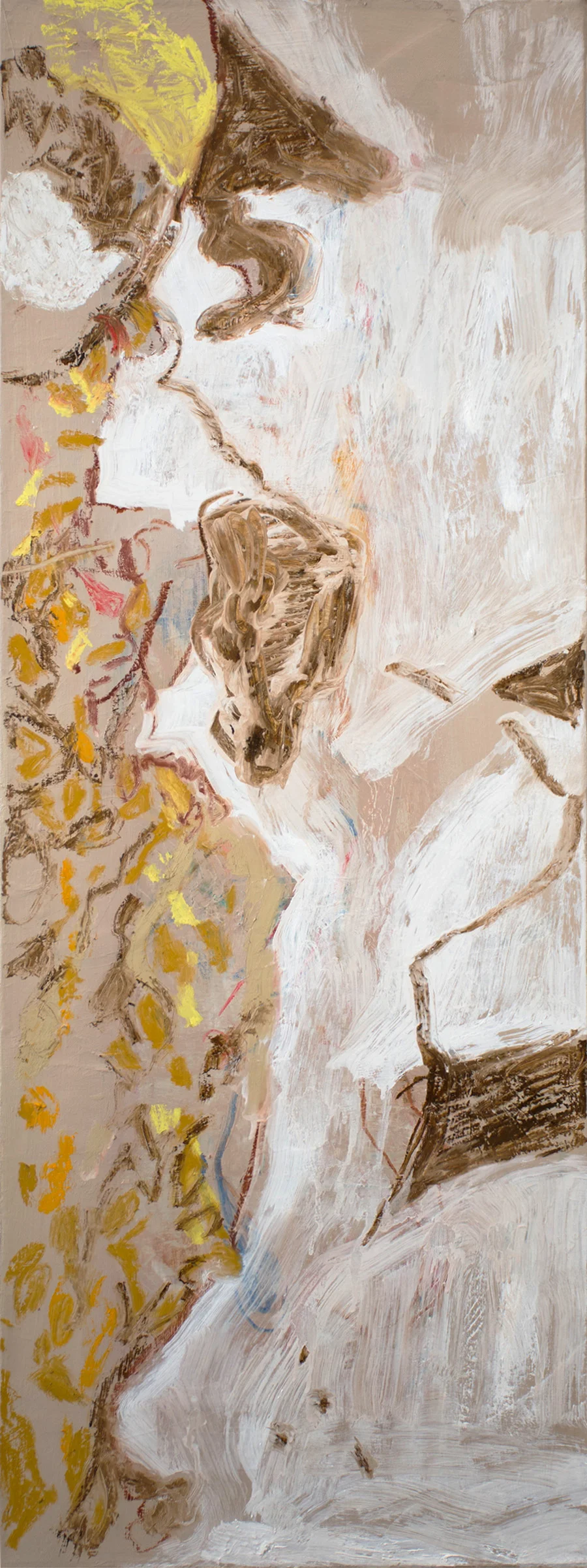 2:51 PM: today i began making studies for my scroll project. it will consist of four 84x18” scrolls on unprimed linen, which will hang next to one another, about 4” apart, forming an 84x84” composition once they are hung. each 84x18 painting will be able to stand alone, or can be hung, as they will be in the may exhibition at space gallery in denver, together. together they will form one unified composition.