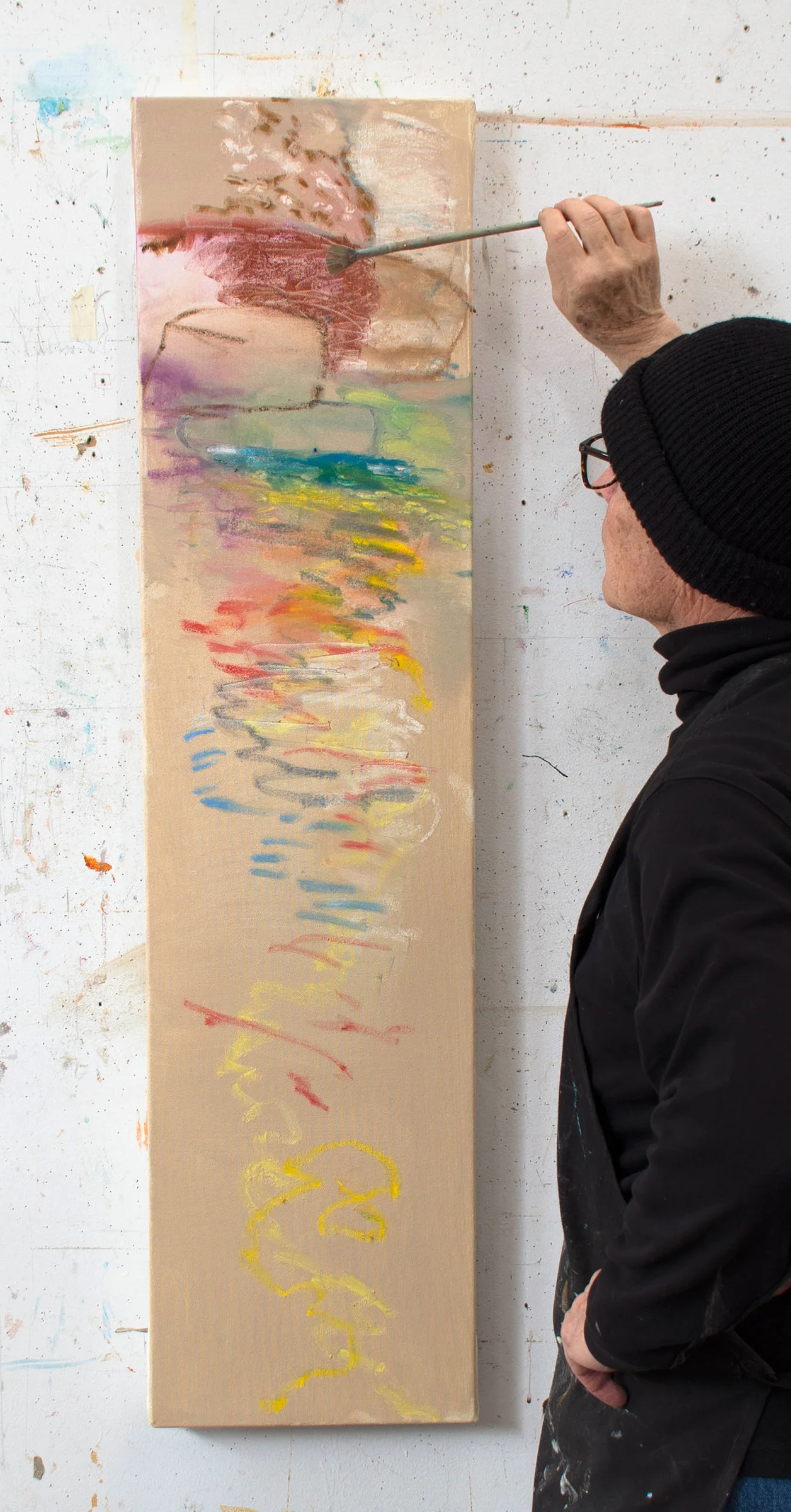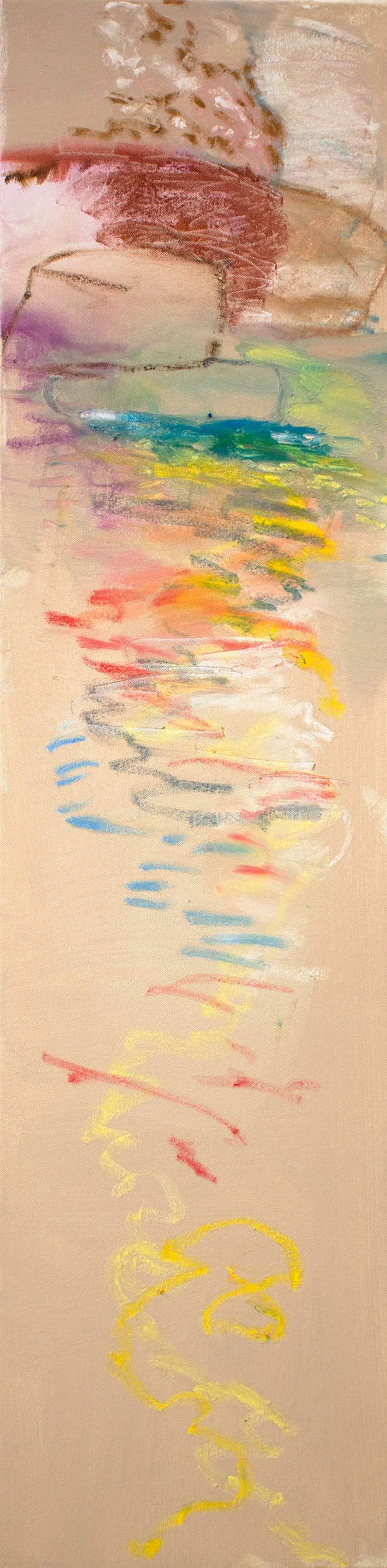 today i stretched the third of 3 tall skinny canvasses which are candidates for a doctors office in boulder. i began work on the skinniest: 48x12”. i’m not yet used to the new non-toxic, solvent free medium i’m using, in order to avoid the dangers to my health from using the gamsol product. it’s going to take me a while to learn it’s peculiarities. nonetheless, i began working, and the painting, titled spring creek, as at the early stage you see here. i’ll likely begin work on the second canvas tomorrow, so that i can go back & forth, which keeps me from getting too attached. it lacks the subtlety of the others, but this is only the first of many layers., it’s the layering that begins producing those unplanned passages i so love, which are always suggestive, enigmatic.