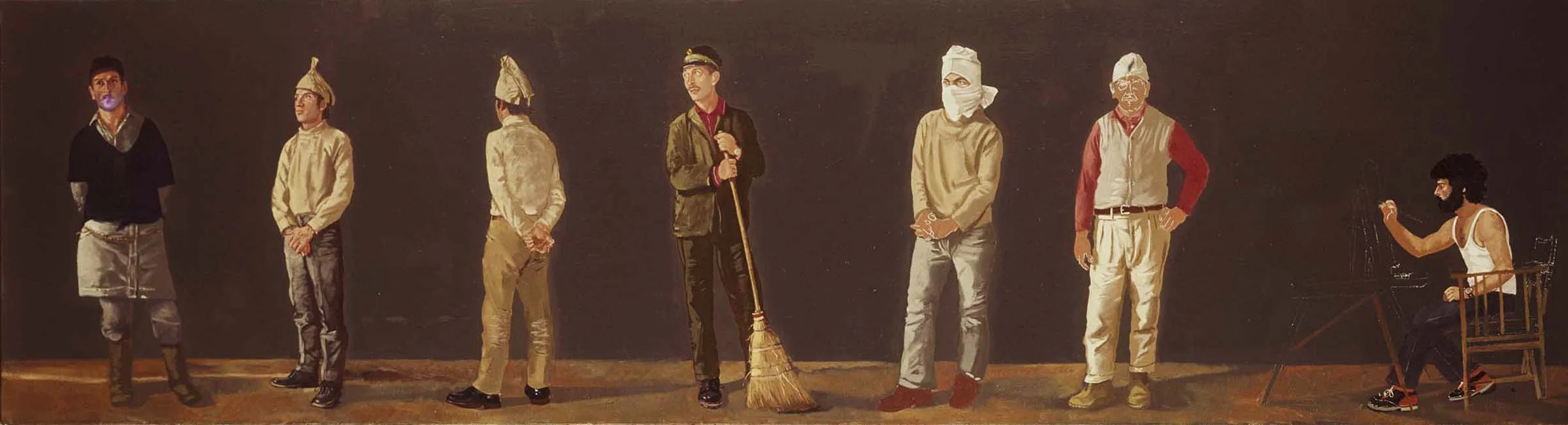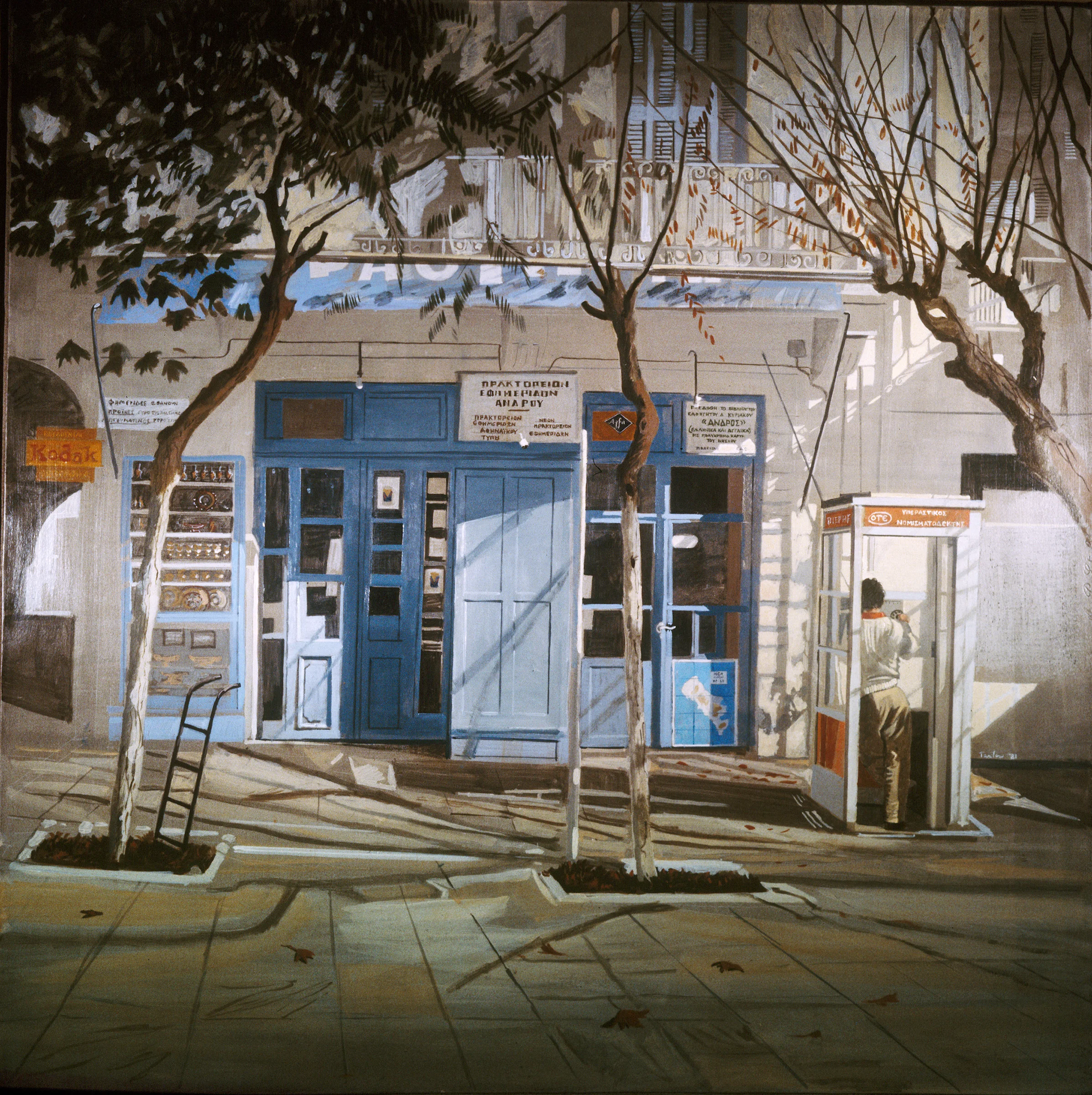collage on canvas, about 2014, from my ano kato series, creek paintings in gouache on rice paper, plein air inoil on linen, 2011, one of my gaze series painting, now in my son dimitri’s theatre in athens, egg photographing hockney’s pool, egg tempera on board, 1980 (in hockney’s collection) me with construction workers in my athens studio, 1975, private coll., athens, phoning home, egg tempera on board, 1978.