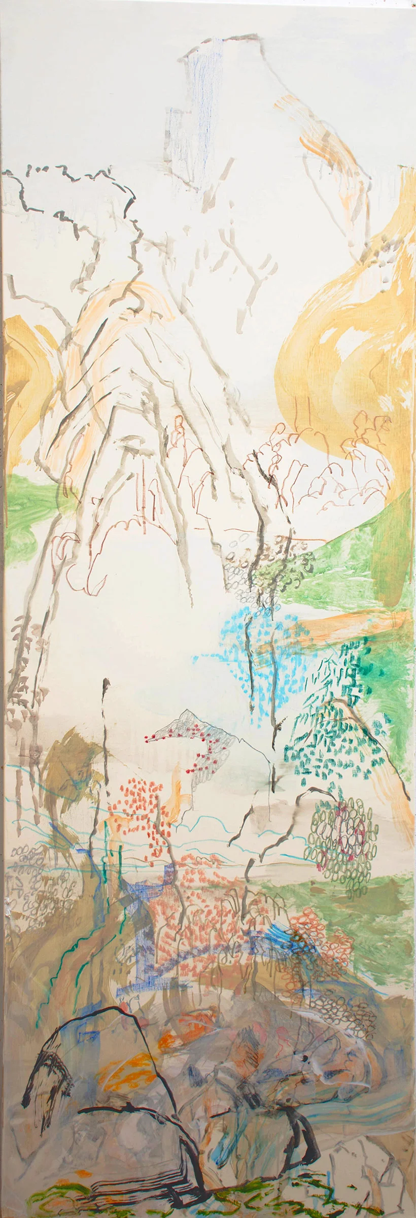 3:15 PM: it’s best to stay off my feet, so instead of returning to the 78x26” taiga inspired oils, i sat at my work table and made a small gouache study of a taiga scroll. it was interesting to shift to a much smaller scale, and to gouache on paper. it was a good day and, that being said, i can’t wait to get back to the larger oils. i feel like i’m in the groove with that series; that my learning increases dramatically with each successive painting. i may take some of the recent completed ones back to the house, and switch them out with the earlier ones, which may be subject to tweaks in the direction of simplification. see the two examples ABOVE.