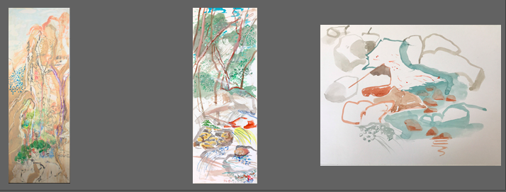 Taiga brings together the strands of my history of mark-making. Working on the Sound of a Flute series is already having a noticeable imapct on my plein air gouaches, allowing me to see the trees, rocks & water with new eyes. On the left: one of my 78x26” Sound of a Flute paintings. In the center, a plein air gouache i made a few days ago, which clearly shows the influence of the Sound of a Flute series. On the right: a plein air gouache made before I embarked on my sound of a flute series of oils.