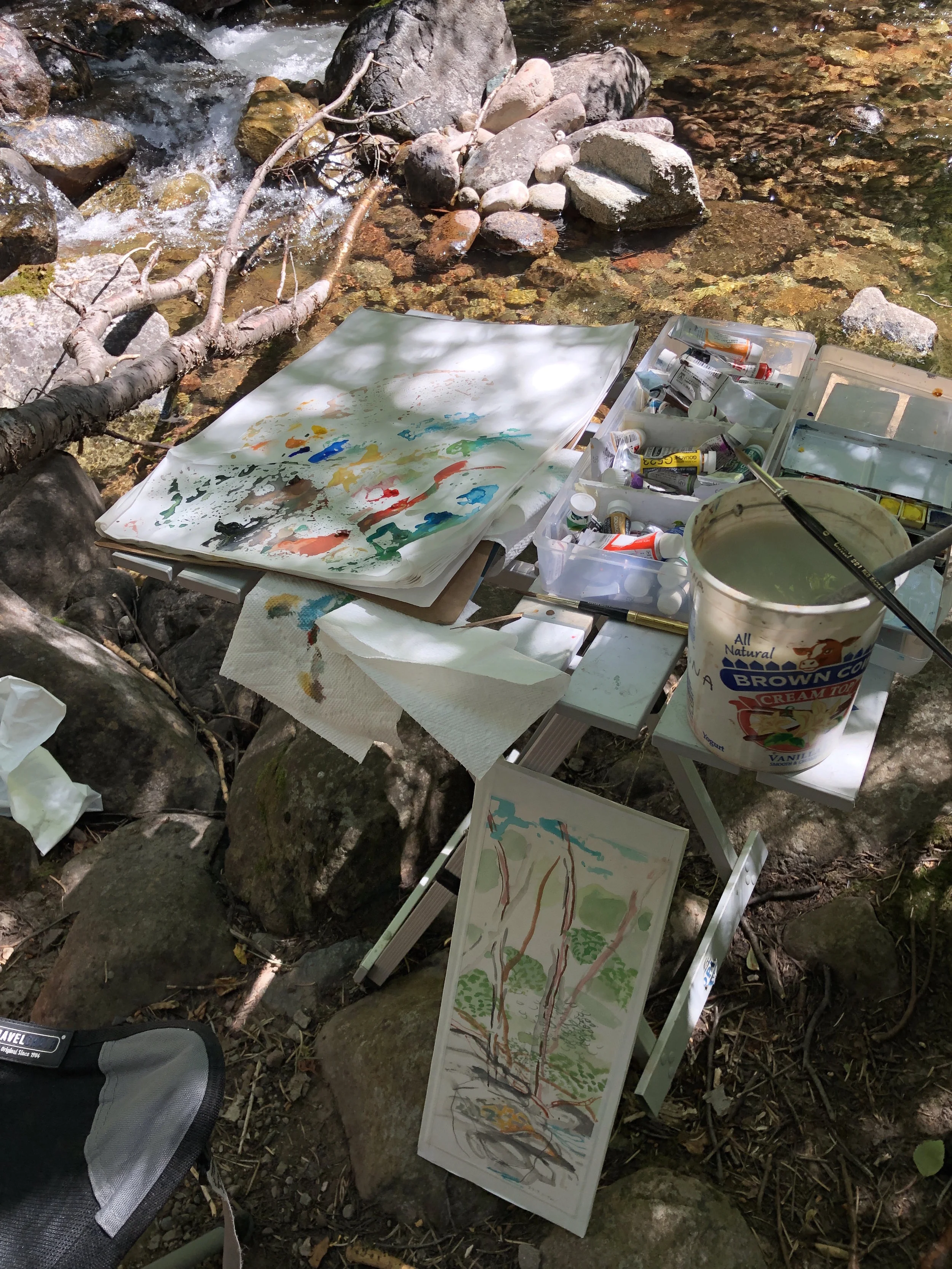 going out to paint at the creek never gets old. today, as has happened in the past, i made a wrong move & kicked my little lightweight painting table, my palette & 2 fan brushes into the creek. i retreived them all, none the worse for the bath. i wouldn’t say i was in top form. i’ll likely go back out tomorrow morning & start one or two new ones. clearly, some of what i’ve learned doing my sound of a flute series of oils is making it’s way into these gouaches.