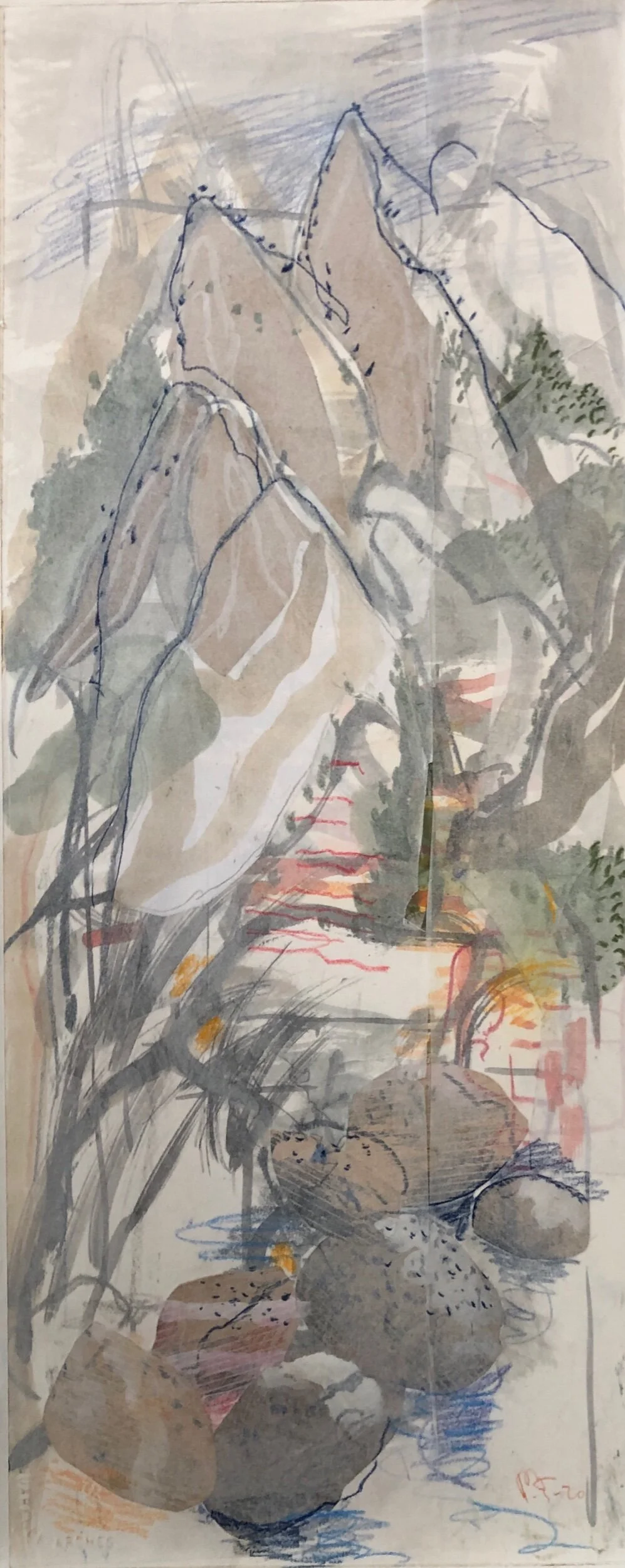 I started a new collage/gouache, using colored pencil & crayon as well. towards the end of the day, i laid a piece of tracing paper on top, using stick glue, but there are a few bubbles. i may do more tomorrow.