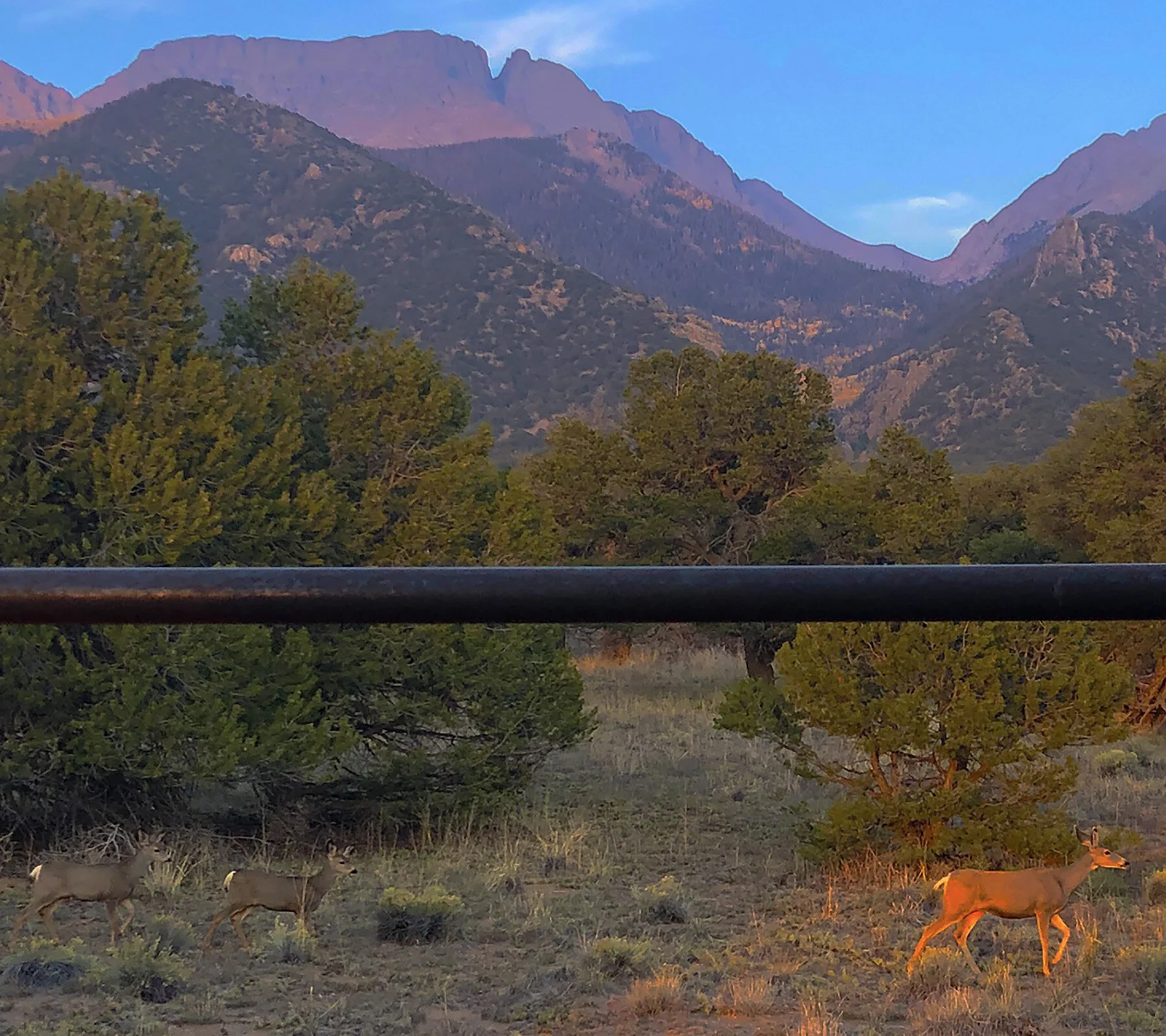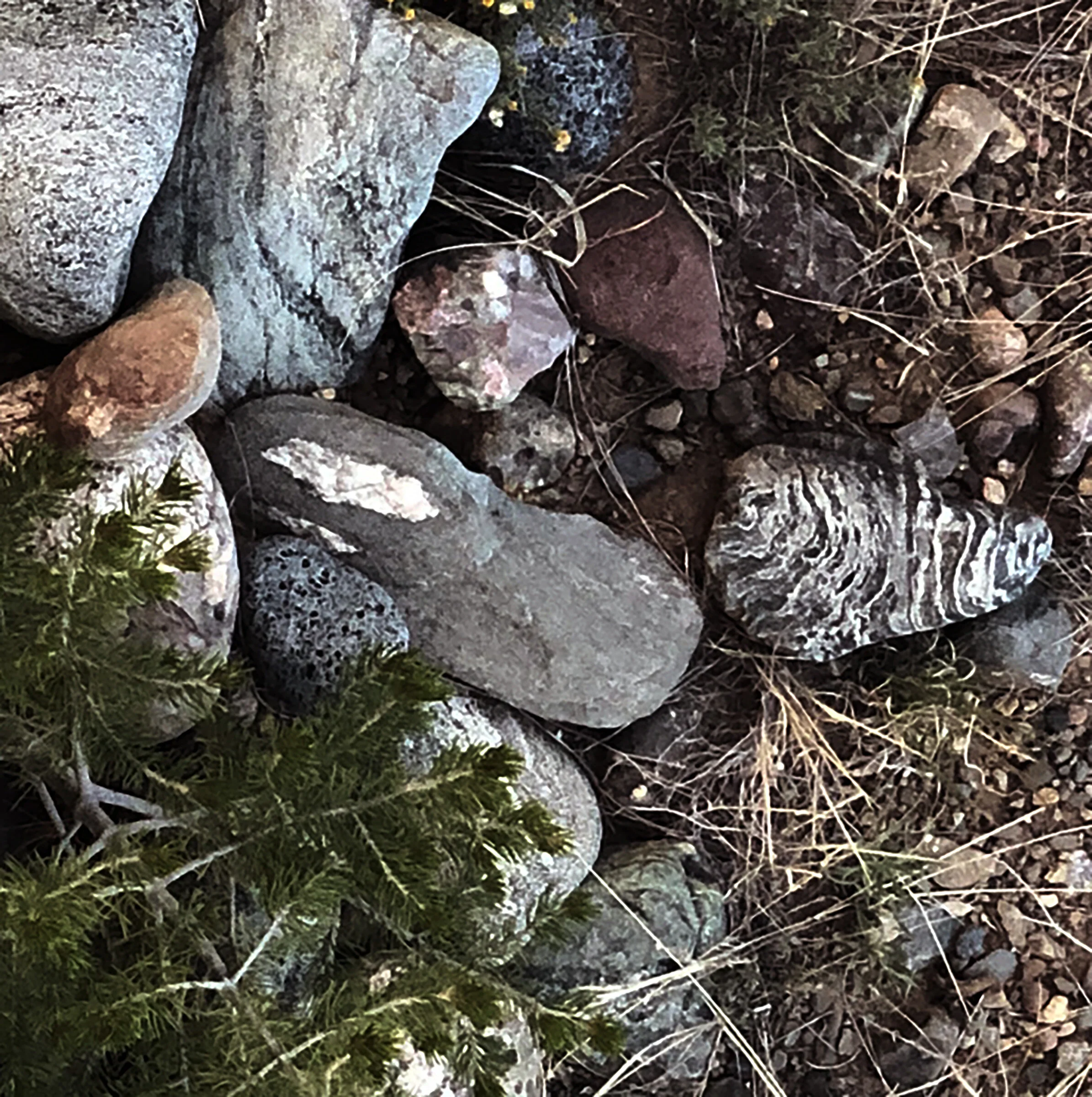 7:28 PM: watching fauci on cuomo. had a sweet dinner on the deck. saw an elegant doe with her 2 kids strolling across our property, watched another beautiful sunset, made richer by the lingering smoke from colorado wildfires. looking straight down, a shot a photo of our crstone conglomerate rocks.