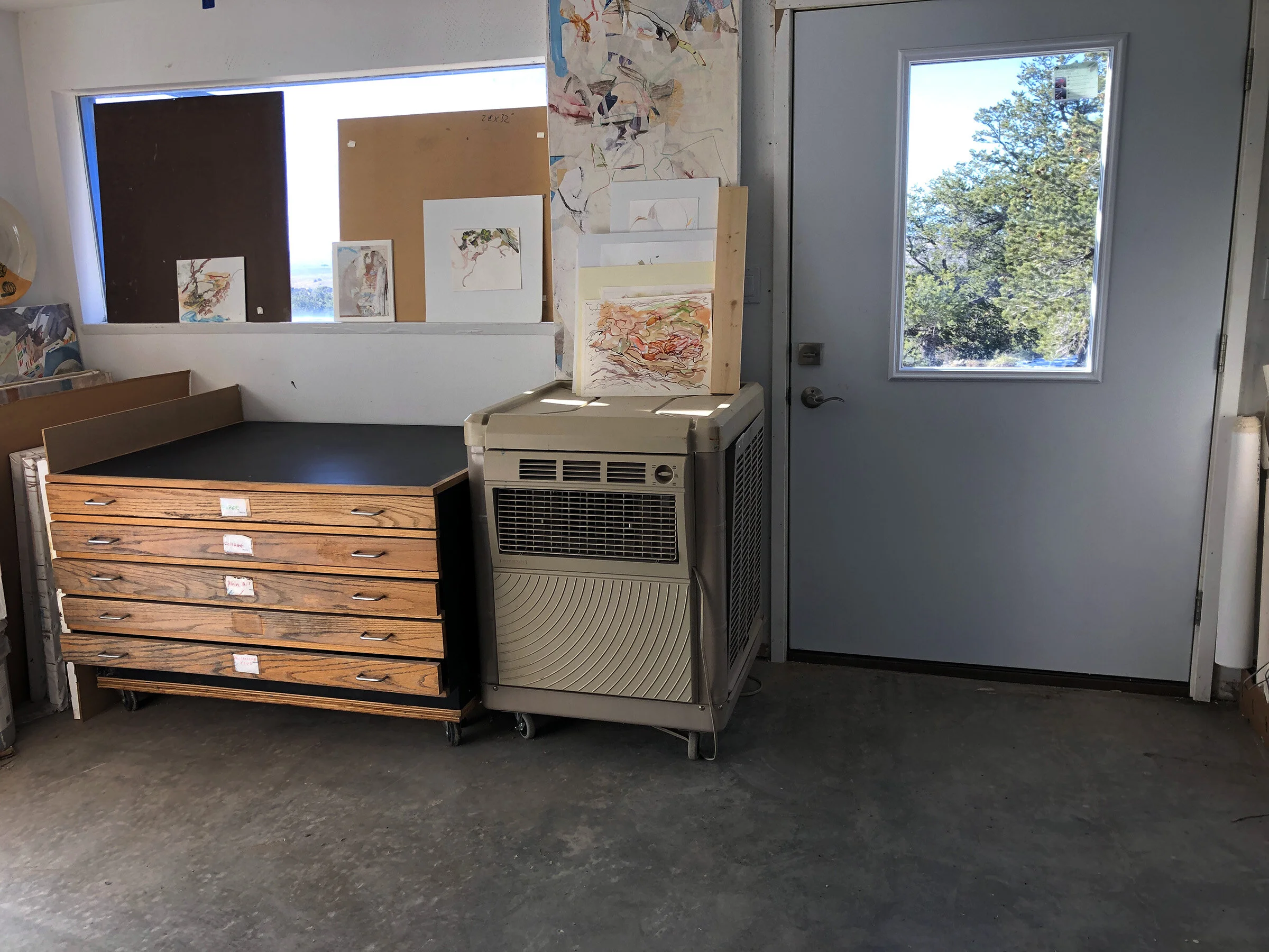 1:43 PM: i could no longer stand looking at all the papers & cardboard piled high on top of my flat files, which are on the right as you enter the studio. same with the stuff piles on my large evaporative cooler on wheels, next to the flat files. so i cleaned them both off, along with a bunch of cardboard boxes. swept the floor and now my entryway, at least, is looking cleaner. i’ll be going through the rest of my studio interior in stages.