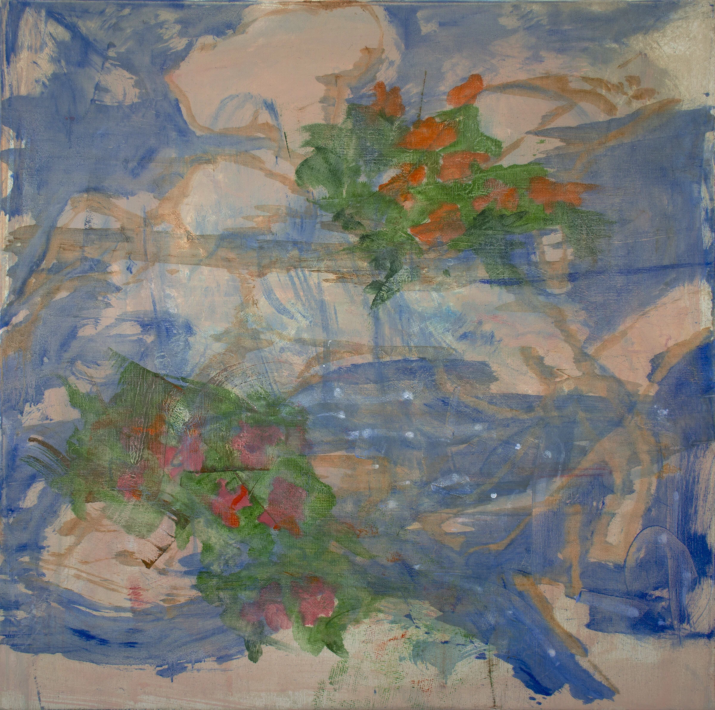 BELOW: yesterdays version on the left and todays on the right. the underlying pink and freshly applied orange/siena marks form rock inspired shapes and the blue mimicks creek water, with faint white dots indicating bubbles in the water.
