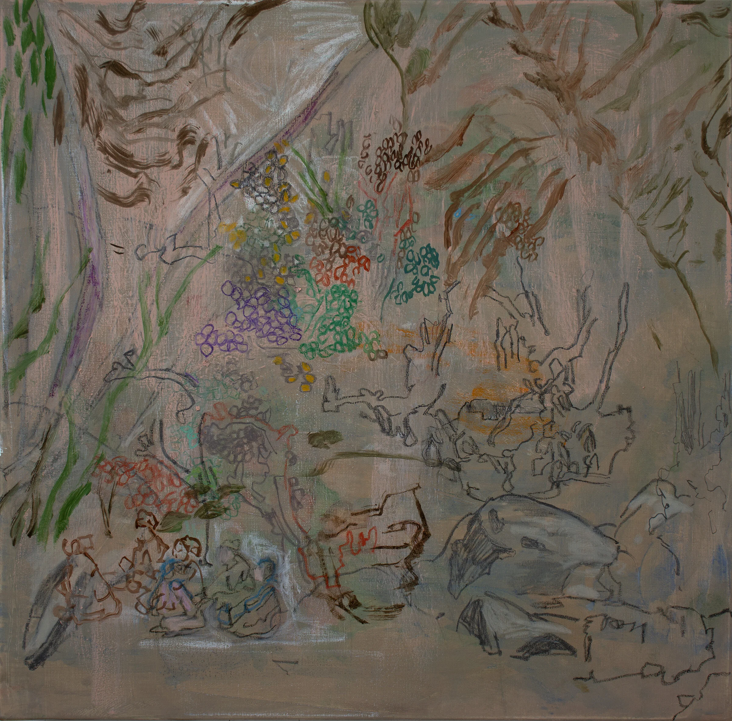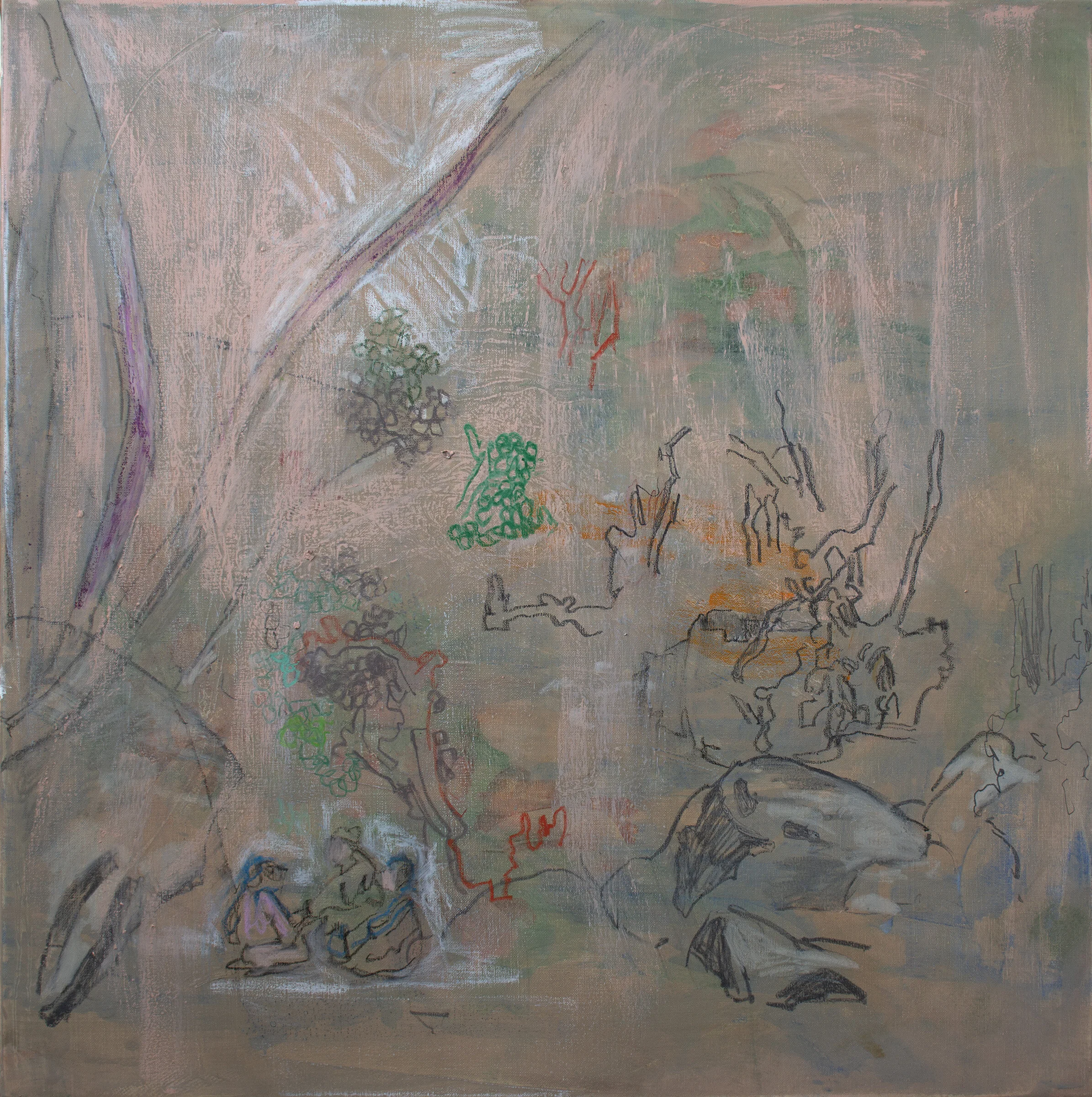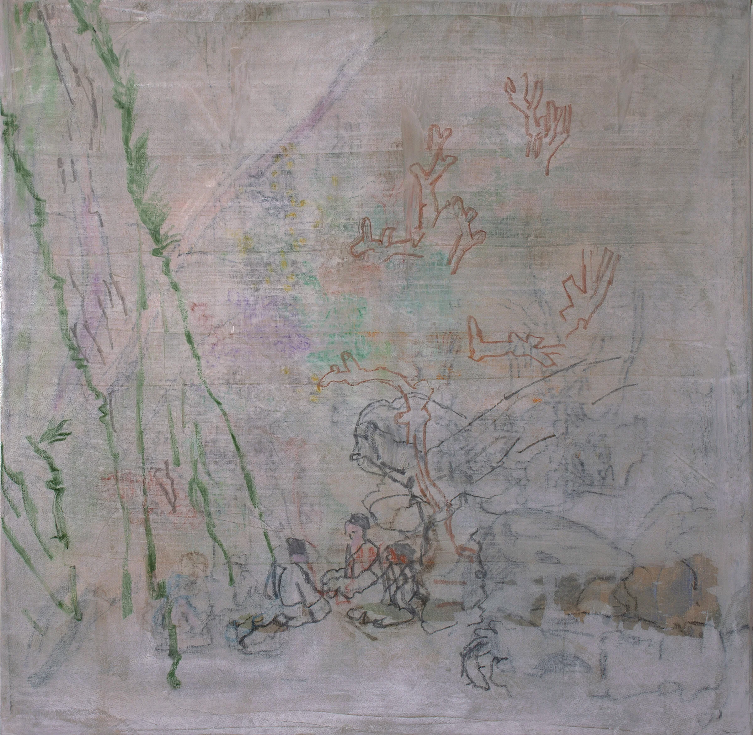 3:19 PM: the ground on this painting, which has been painted over at least a dozen times, was simply too dark. i liked the deep pink, but everything was tending to sink into it, creating a dark vibe that wasn’t me. so naturally i went over the whole thing with a thin coat of titanium/zinc white and then started painting & drawing into it while it was still wet. the result thus far, which you see in this final photo of the day, has a warmish grey tone, with the underlayers peeking through as usual, creating a somewhat mysterious image, which i’ll paint and draw into tomorrow morning. the seated figures are inspired by taiga’s paintings of scholar/poet/painter/musicians sitting under the trees near a waterfall, sharing their stories. i feel a strong connection to these guys and their way of life, endangered as it was by the uncertainties of ever changing regimes, which made it necessary for them to flee at a moments notice, in fear for their lives.this human presence in a painting means a lot to me, and very likely to those who will see them. there’s a story here. right now, just telling the story of our magical creeks is not enough for me. i need to dream the story of these 18th c. buddies of mine, and how they reveled in one another’s poetry, music and painting.