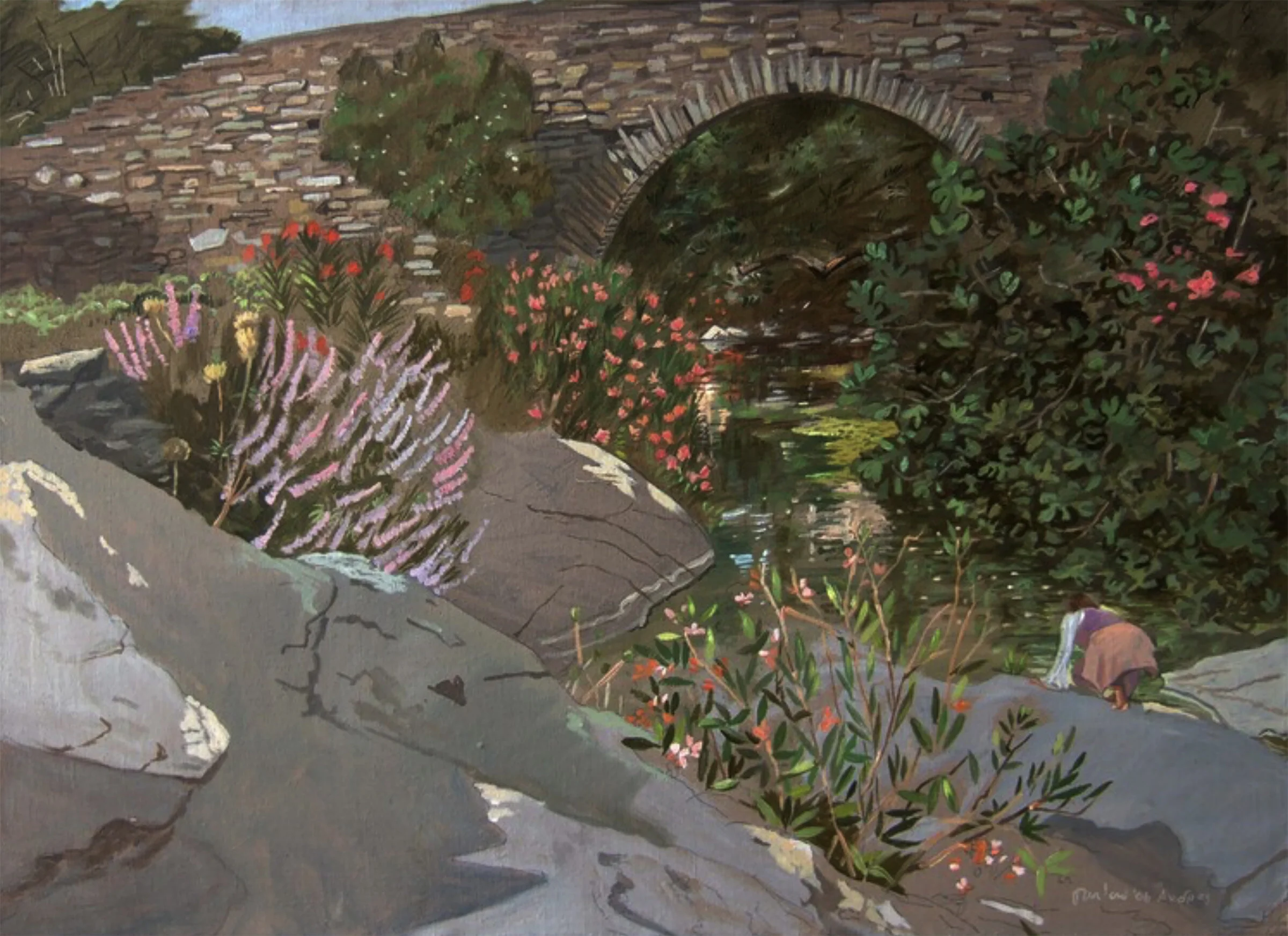 Two of his friends from Athens were there, and one day we all went to Pithara together. Pithara is a beautiful, small waterfall in the hills near the village of Apoikia. I've made many plein air paintings of this beautiful spot, so I know it well. I shot lots of photos that day, and when I returned to my studio in Crestone, I used some of them to create the series of paintings you see on this page of my blog. The following year, they were shown in my 2006 solo exhibition at Skoufa Gallery in Athens. They are now in private collections in Athens. One of my favorite subjects is the human figure in the landscape. Corot, and so many other painters, made great paintings with this subject. My dear friend & mentor Tsarouchis made some of my favorite paintings of figures sitting & standing on Pnika, adjacent to the Acropolis.The attached painting is just one of many paintings I've made of figures in the landscape. This one is based on a photo I shot at a well known stone bridge on Andros, of a woman fetching something she sees in the stream. We'll never know what it was she saw. In the gouache you will be using for your cover, Dimitri's friend, lets call her Maria, is looking at the falls, with her back to us, awed by the beauty: the fragrances, the colors, the sounds of the falling water, the light....It may be that, in this fleeting moment, sitting on the rock, she had a flash of deep understanding of who she is in all of this, and how her identity is merged with, inseparable from, nature.