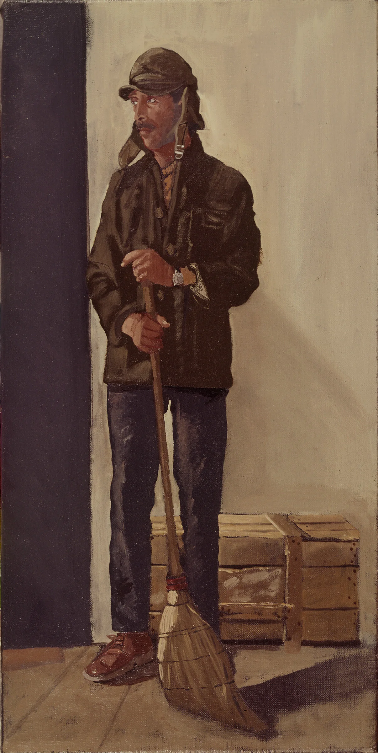 BELOW: one of my many paintings of kyriakos with his broom, to which i refer in my email to the author in greece.