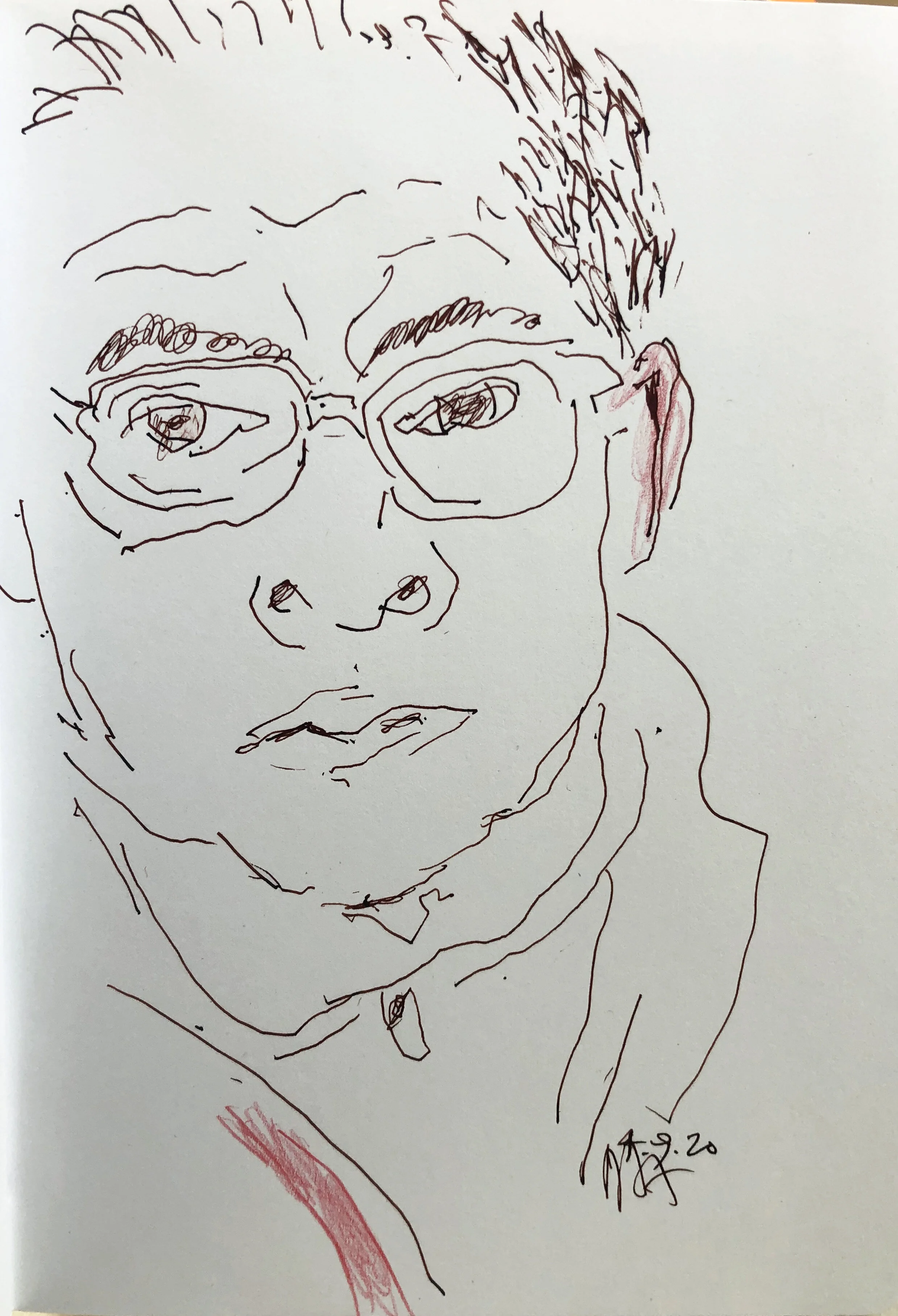 8:19 AM: this morning first thing i made a new self portrait, this one in ink, which i sent to manio & philip in athens. yesterday afternoon i brought watercolor 14 over to the house for evaluation. it passed with flying colors. here she is in our entryway. she’ll return to the studio in a few hours, where she’ll join her brothers & sisters on my east wall. the racket you see in the foreground is called the executioner, and is a very effective way of dealing with flies & mosquitoes. press the little button, swipe at one of them, and zap, it’s over!