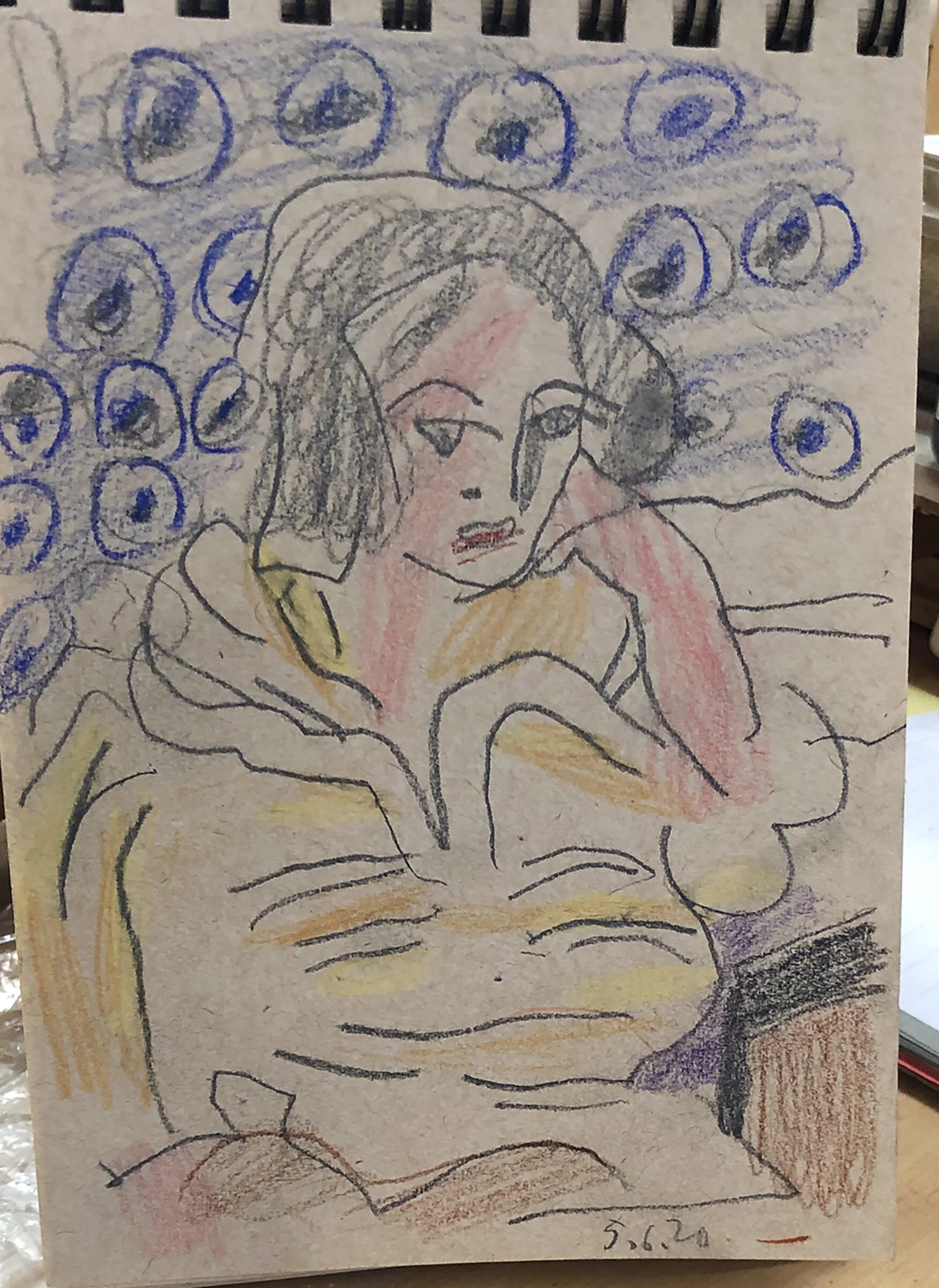 1:36 PM: i’m at work on watercolor 45. while taking a toast with feta break i made this little study of a matisse drawing in colored pencil on tan paper, BELOW LEFT
