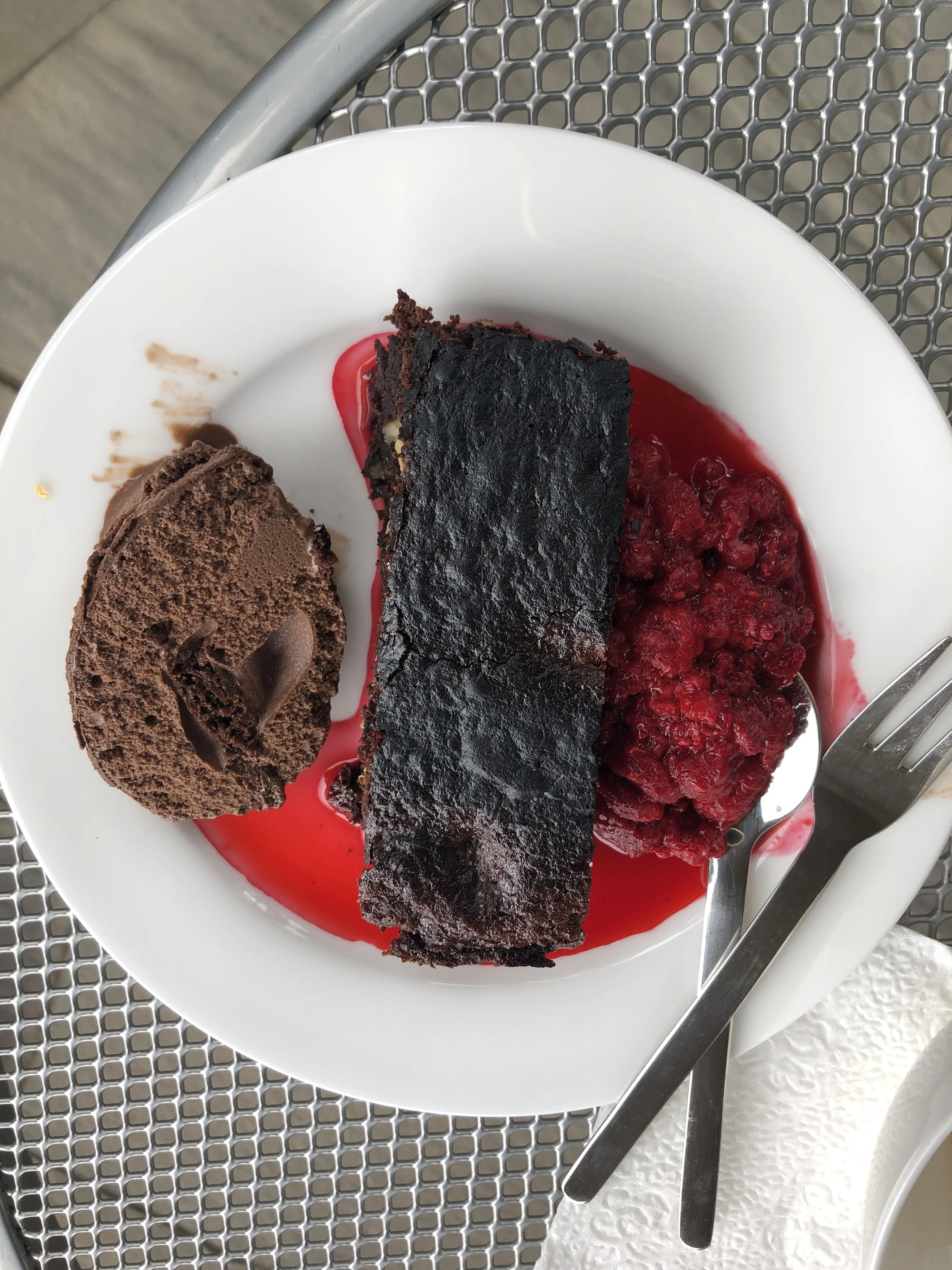 6:30 PM: today in the studio was devoted to logistics. i didn’t have the energy to paint; i was mentally preparing for a zoom i had at 3 regarding my august show in carbondale & i knew immediately afterwards we had our jour fixé with dear friends, always a delight. i made brownies, we brought non- dairy chocolate fudge ice cream and they added raspberries to the mix, which looked like this.