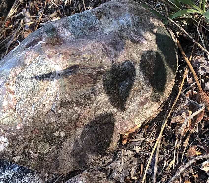 i told the story to our friends just now as we were eating and drinking together. i showed them this photo, which i hadn’t really looked at. nothing unusual. and just now, as i posted it here, i saw 2 rocks, one of which, in the background, had the leaf shadows i was so excited about. the one in the foreground however….what are those black leaf shaped marks? they look too dark to be shadows. what else could they possibly be? i don’t get it! i’ll have to study them more carefully. the ones on the rock in the background have the distinct look of shadows. but the one in the foreground? it’s a mystery. they are simply too dark for shadows, and the texture of the rock doesn’t show through, as it does in the background rock. now those look like shadows should, right? my painters eye is confused, and i can’t wait to get back to that spot on our sunday walk. until then, it will remain a mystery.