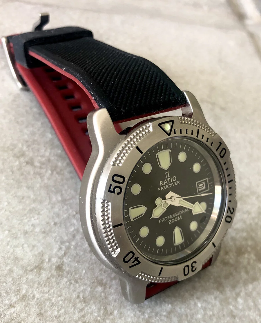 this ratio is a chinese take on the many far more expensive dive watches out there. it’s well made, beautifully designed, very light on the wrist, with rotating bezel and a case measuring only 10mm thick. most watches are 12-14mm. it came with a rather ugly dive strap, which i promptly removed and replaced with a textured silicone strap in black and crimson. i probably won’t wear it to bed, as i did with my croton when i was 12, but for the foreeable future it will be on my wrist the rest of the time.
