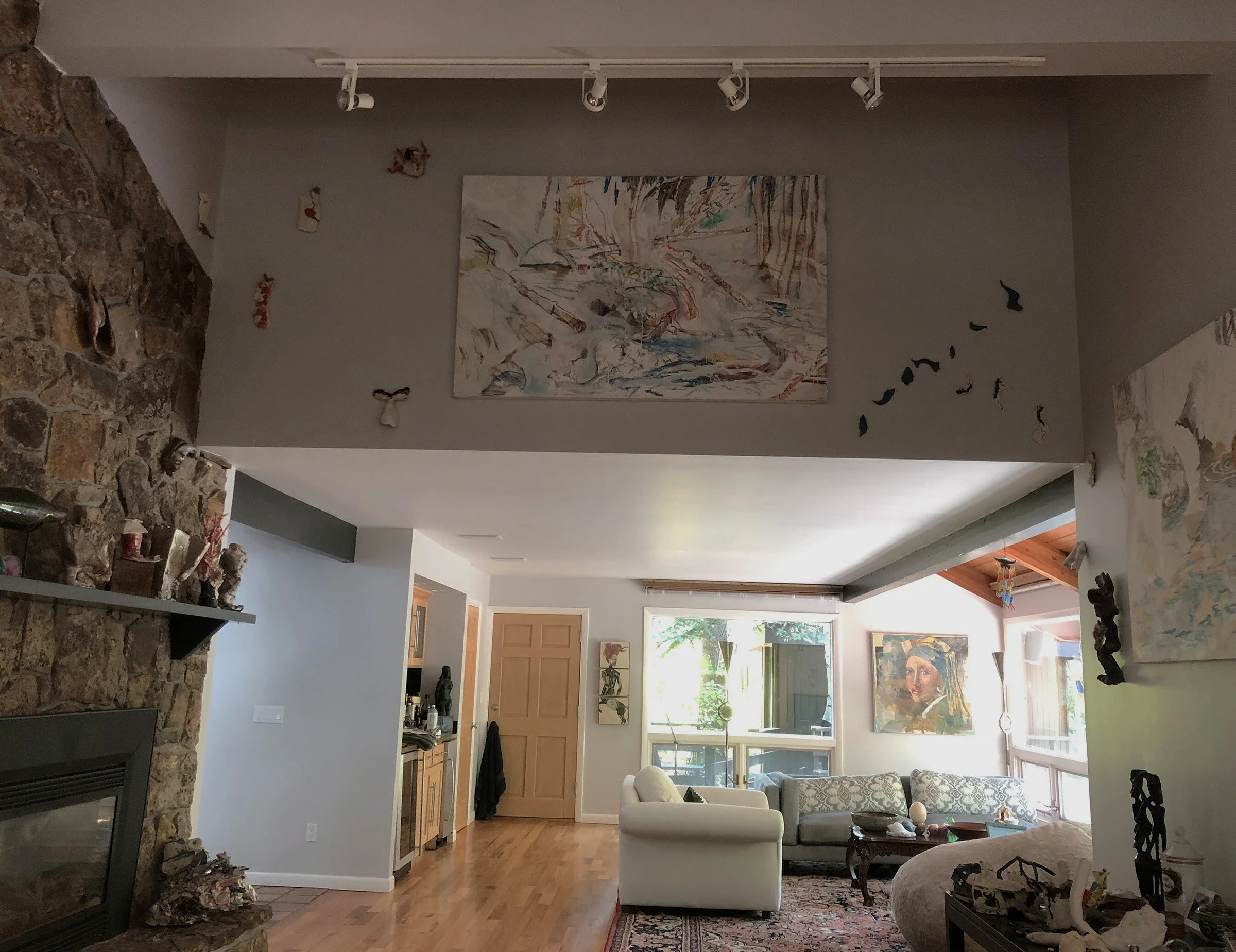 you will see that some of the paintings are surrounded and enhansed by d’s ceramic art. you can see one of his pieces, with his painterly blue strokes, on the bottom row, right. he has great talent as a ceramacist, especially when you consider he came to ceramics at the tail end of his long and successful career in the medical profession,as an infectious diseases specialist. his pieces are instantly recognizable.