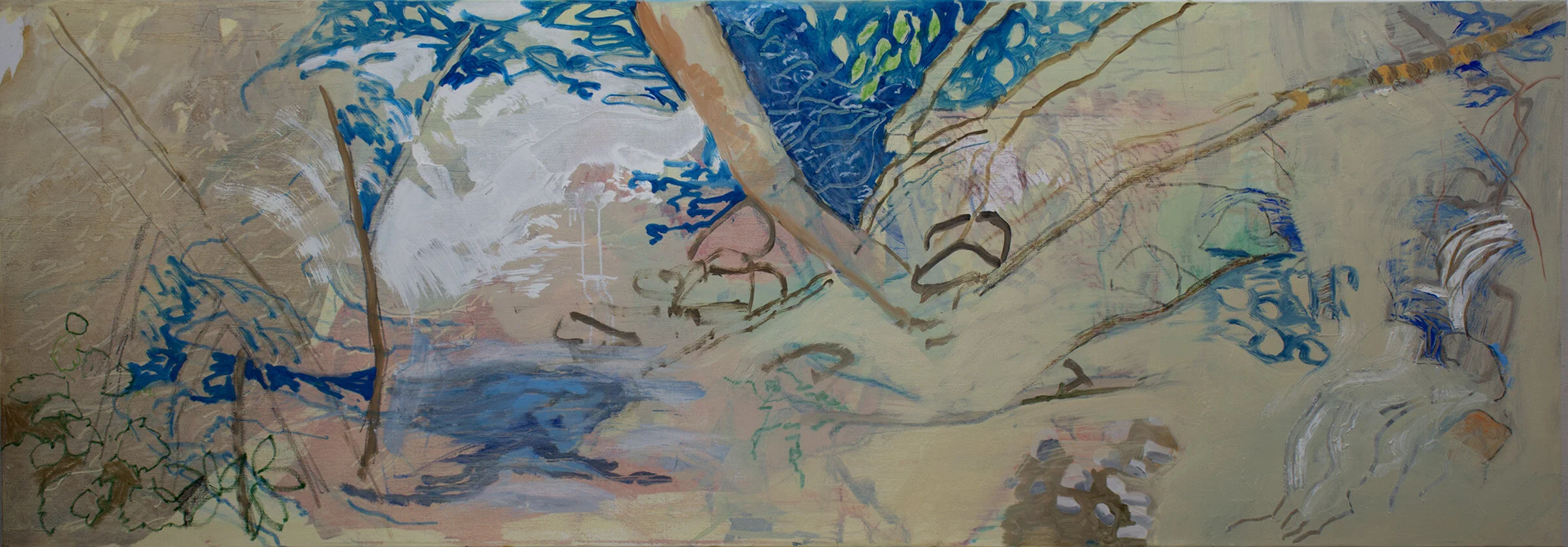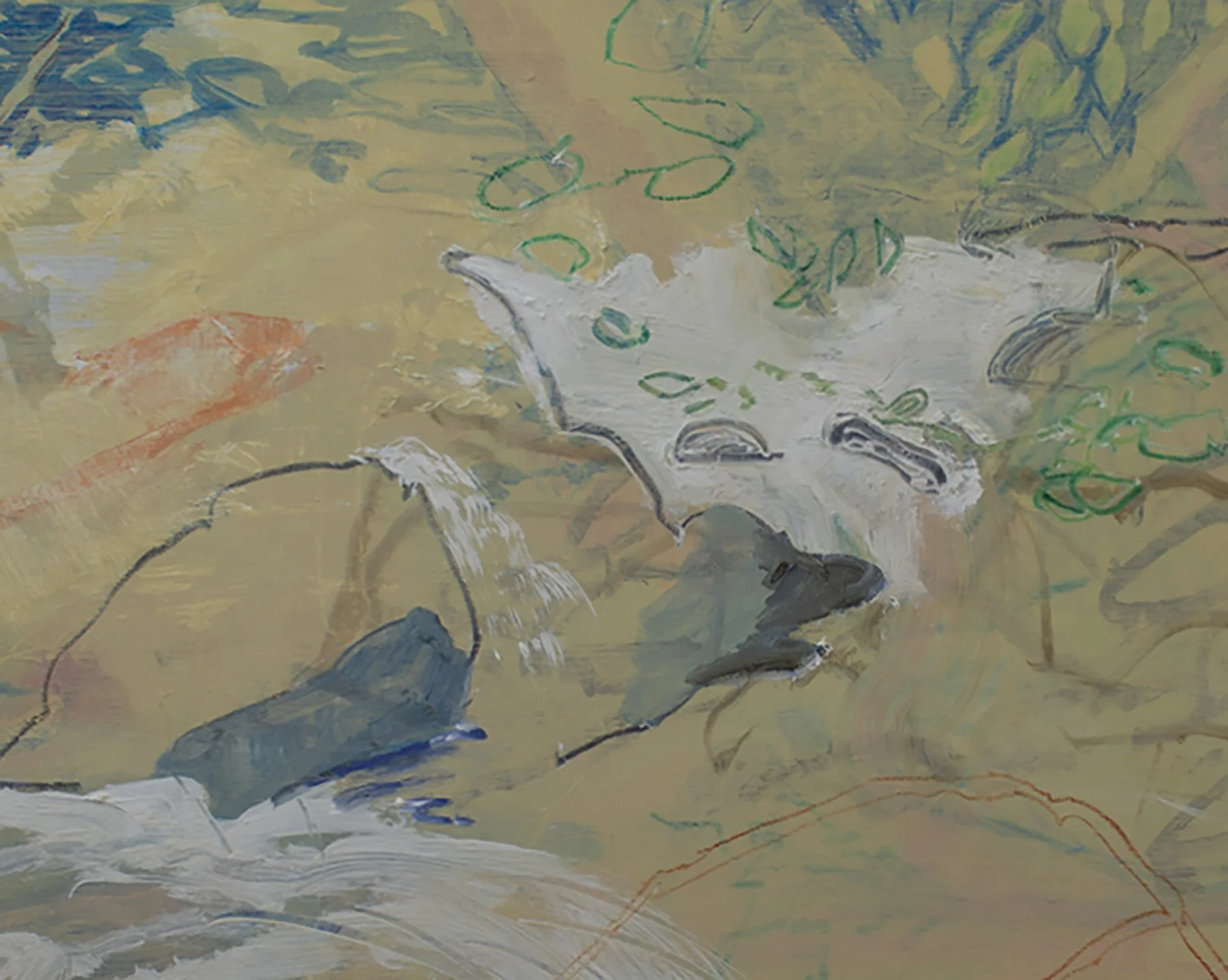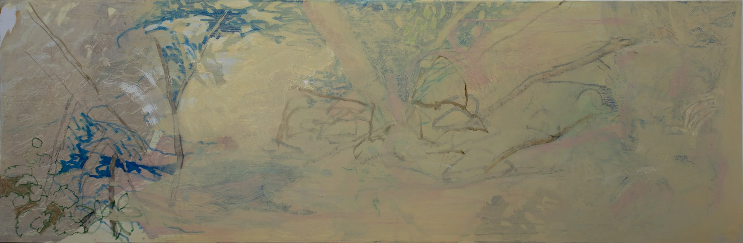12:55 PM: my first glance at recent work usually lets me know what needs work. today it was 2021 creek oil 1. the left portion looked ok, but the center and right areas of the composition seemed too busy, and my eye got confused about where to look. so i started working on it. it’s in process, but it’s interesting to watch the progression. BELOW right is how it looks at the moment; about to launch back in.