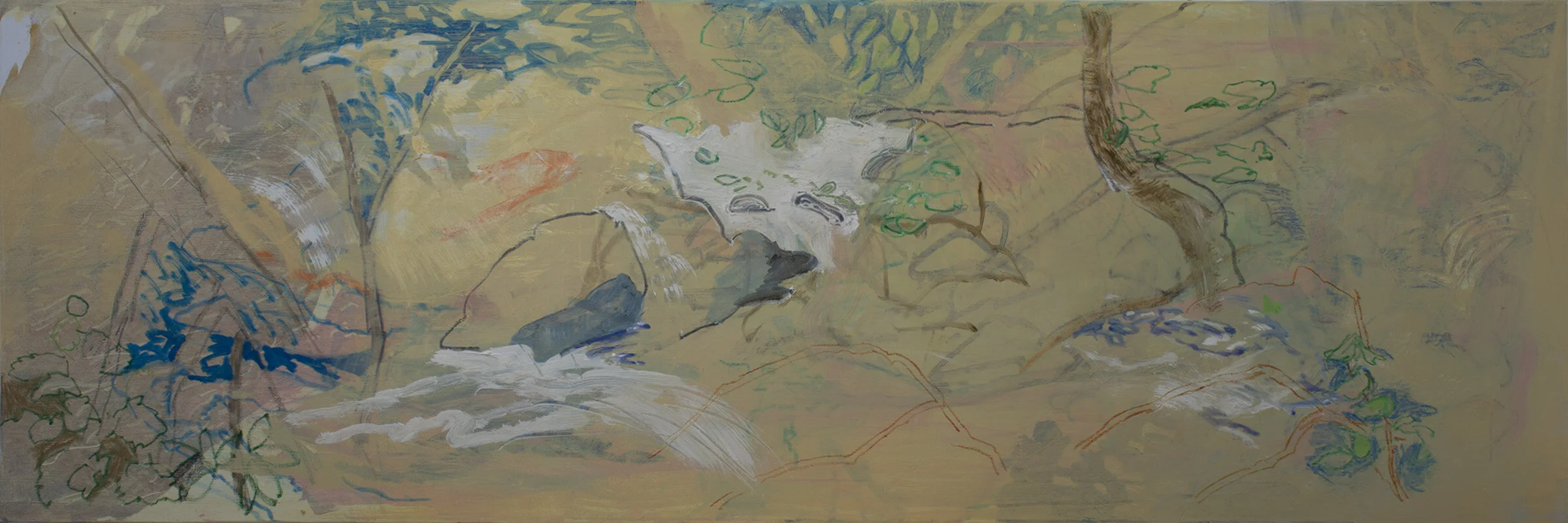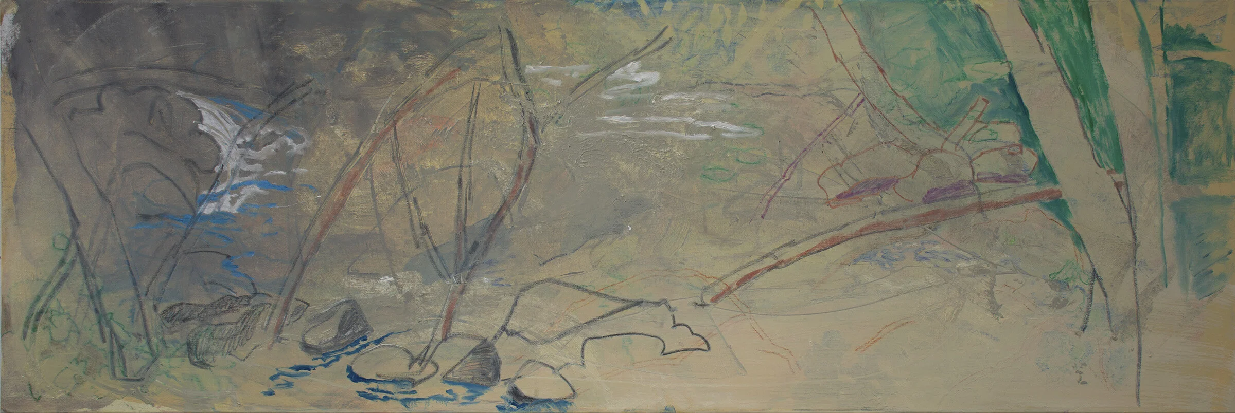 when i felt i could do no more and had to wait till it dried a bit to continue, i moved on to 2021 creek oil 1. the only thing left from the previous state are the faint outlines of rocks and trees. i find the current state interesting, less fragmented, even compelling. the right side works pretty well; the left needs work. i’ll return to both paintings tomorrow and see where they take me.