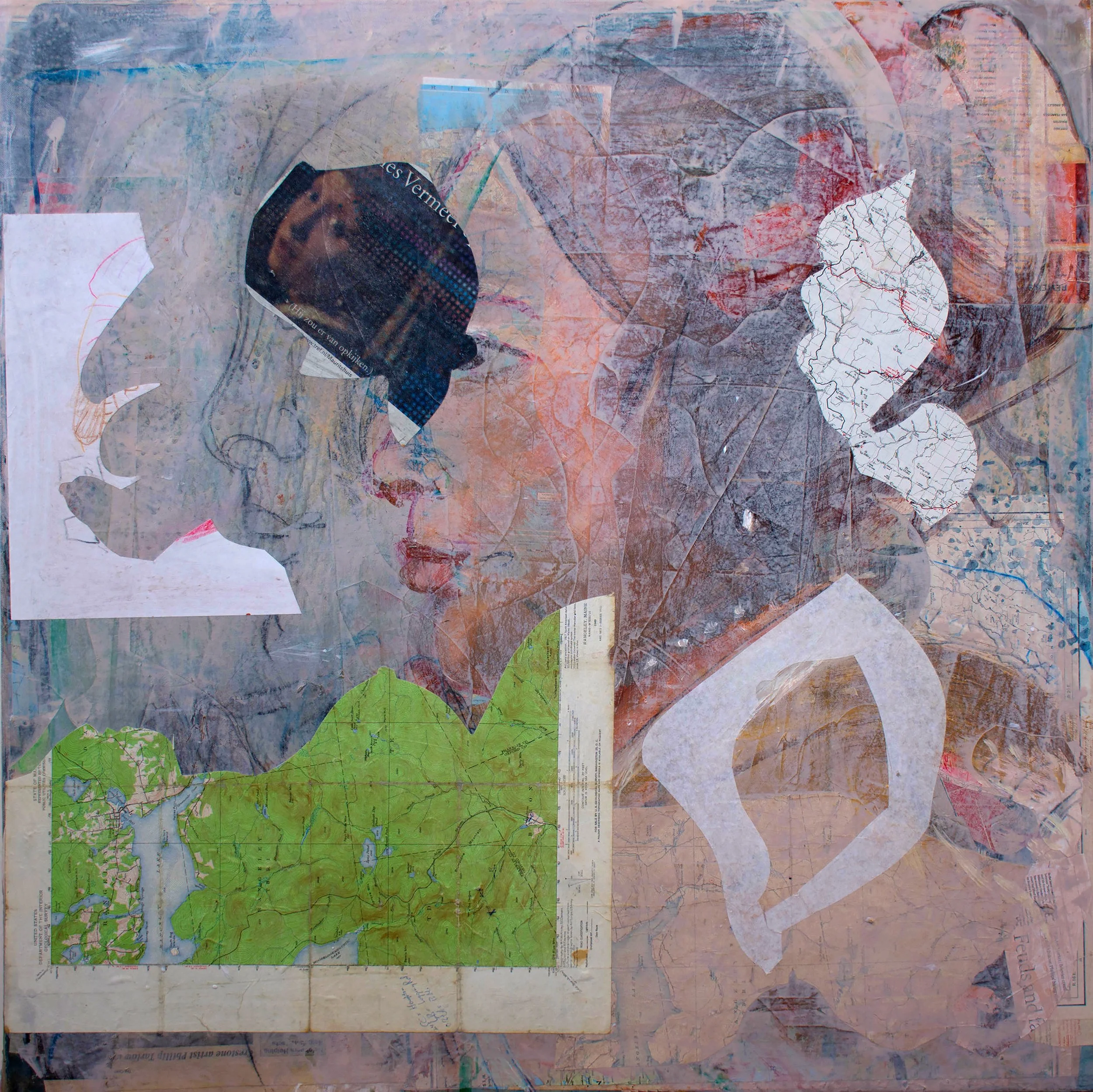 ABOVE left: this is an example of one of my gaze series paintings in progress. the series was inspired by my lifelong love affair with vermeer and 1st century fayum portraits. what you see in this photo had been painted and collaged over, and this is the only record of it. looking back at it, i can see very compelling visual elements, bringing up the eternal question: when is it time to stop & leave it be?