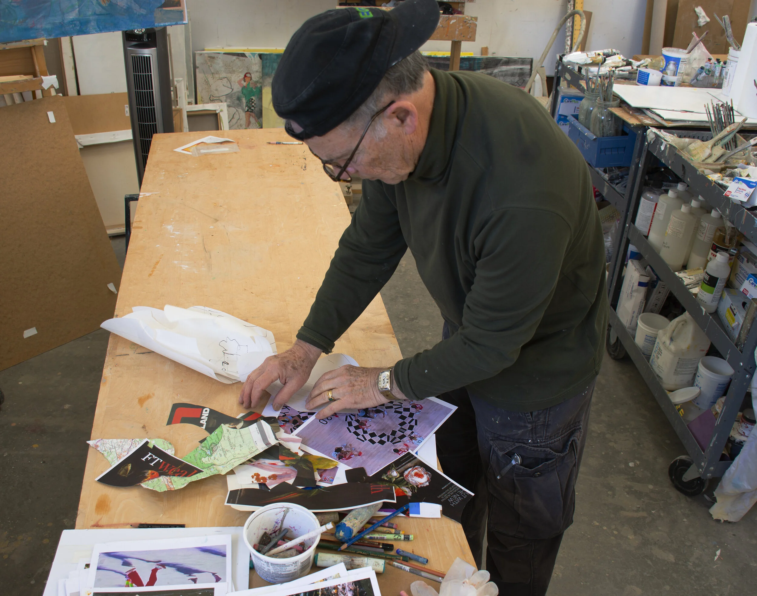11:43 AM: the rain is over for now, and the sun is shining, with a warming temperature of 56F. in preparation for the continuation of my new 10/2/2021 painting/collage, i’ve been cutting up and sorting through b&w drawings, magazine articles & maps this morning & am now ready to dive in, always trying to keep in mind that this first surge of energy is all important.