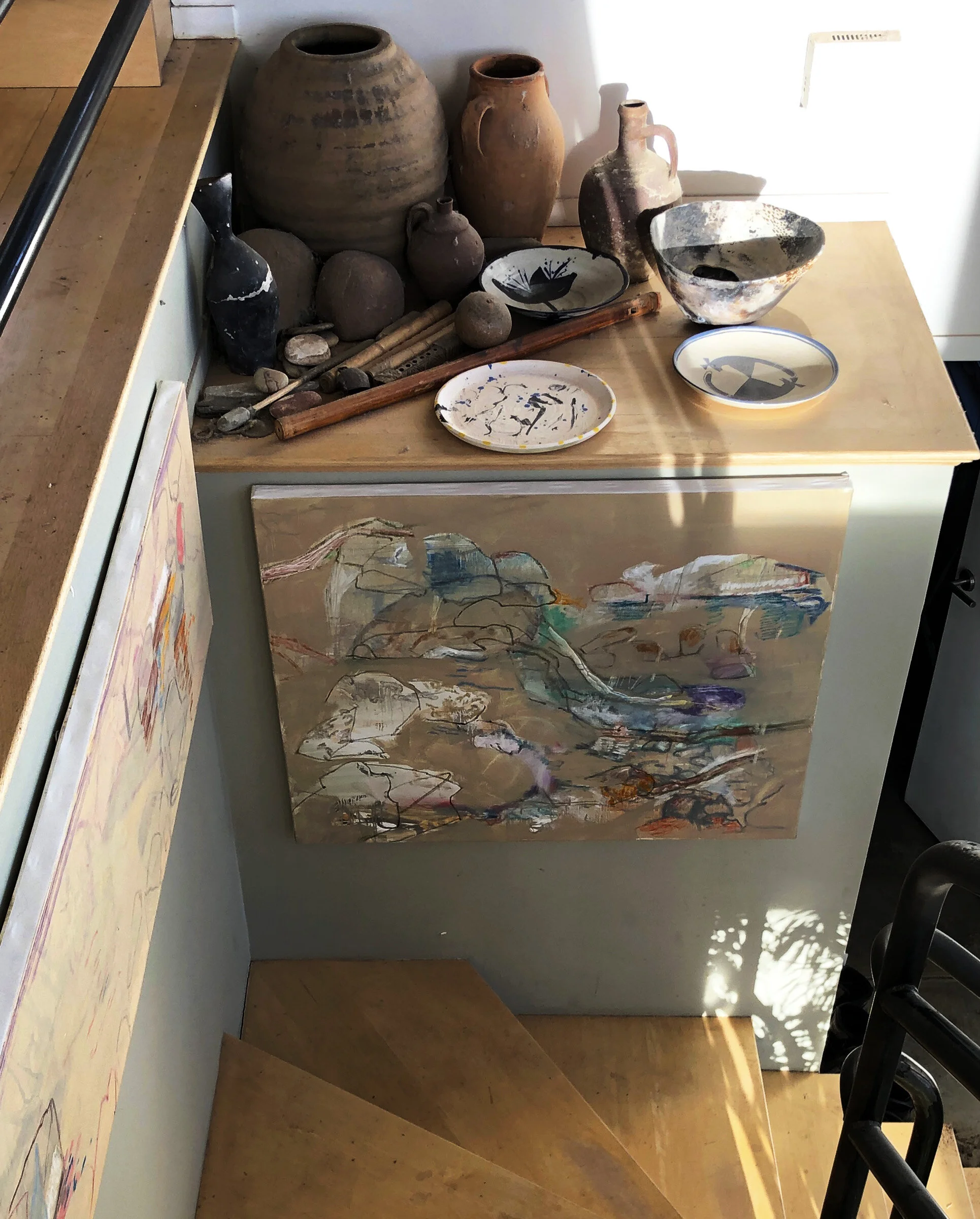 some of the ceramics you see were made by ceramicist friends and painted by me, others are pieces we’ve collected over the years. and i love those shadows from our plants, which shift daily with the position of the sun. it’s a wonderful house mikela designed; a many talented woman she is.