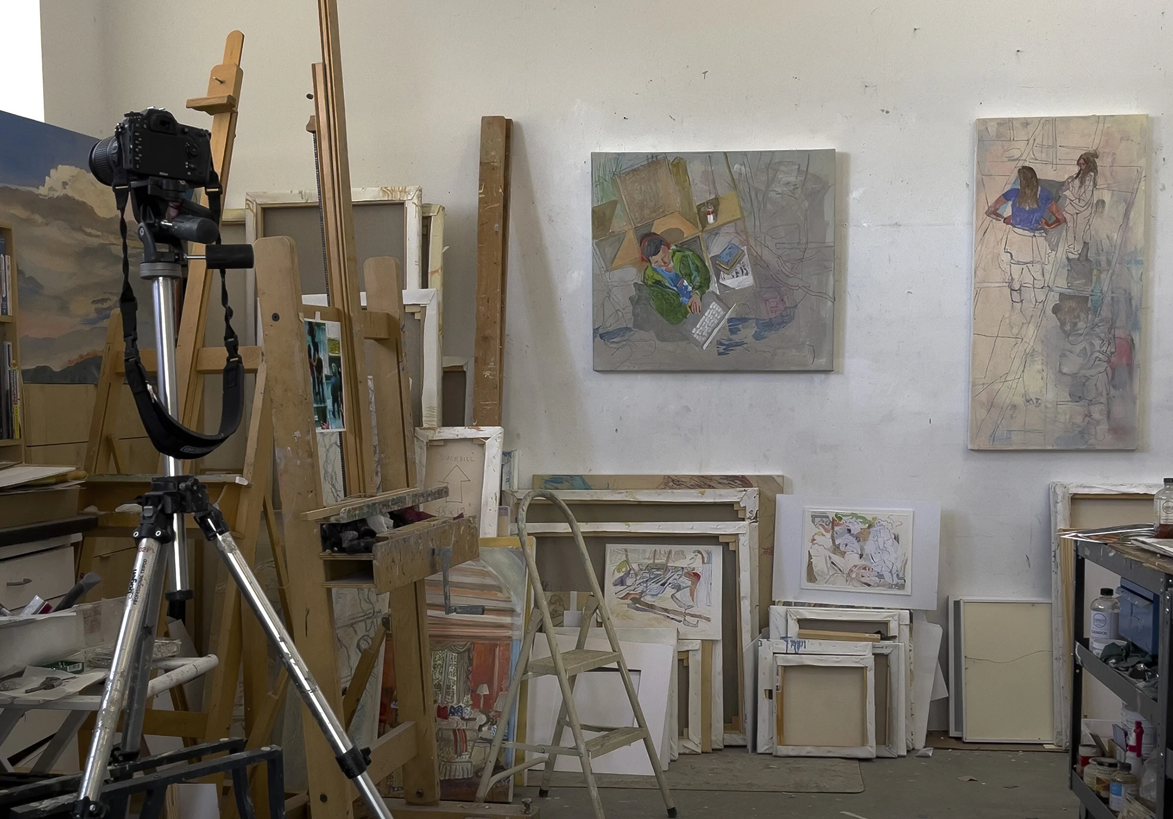 my east studio wall with the two new paintings i’m currently working on: 2021 creek oil 5 & 2021 creek oil 7