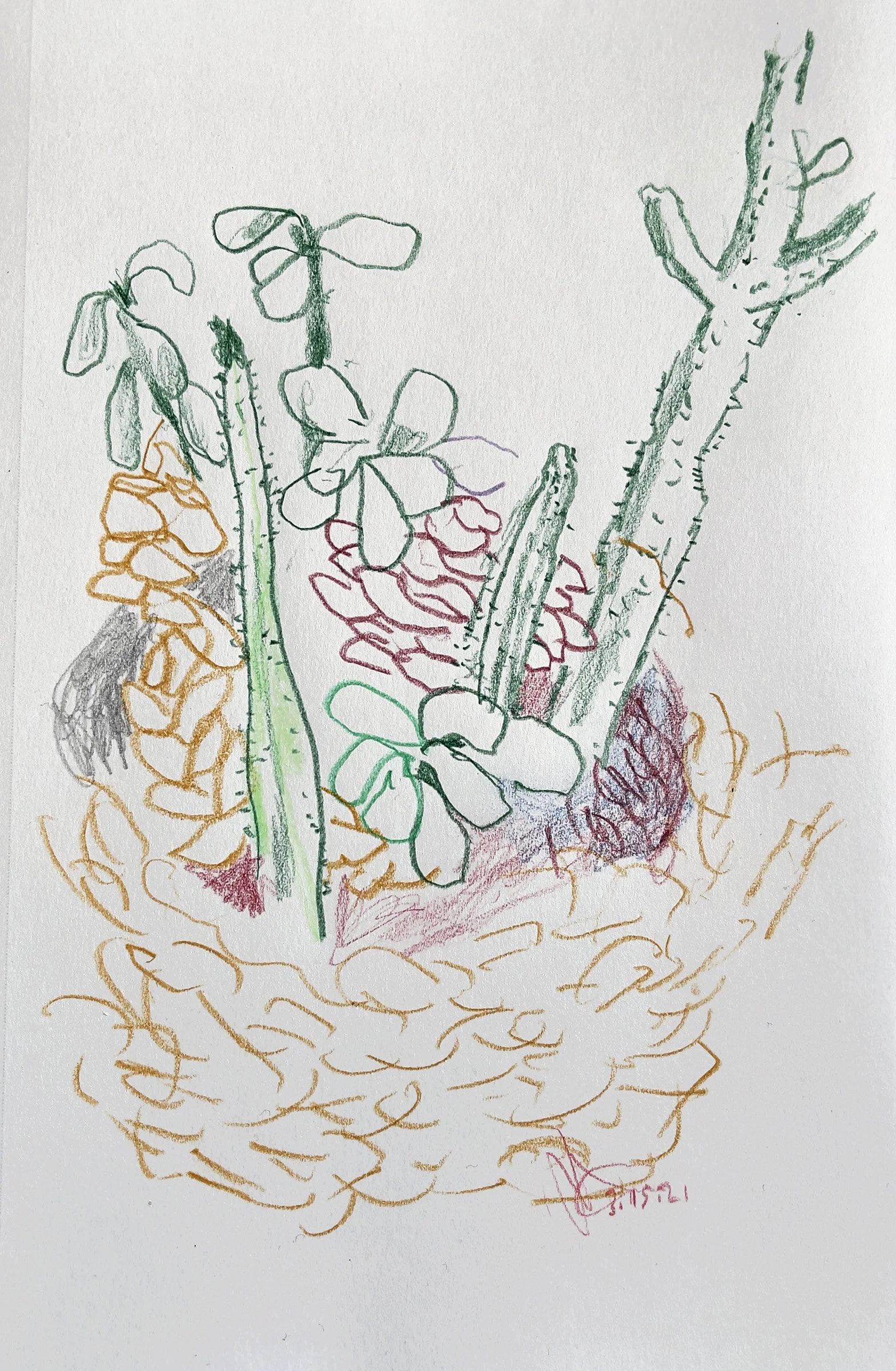 8:56 am: today’s 8am morning drawing: colored pencil on archival paper. cacti: in the corner of our bedroom. and by the way they need water!