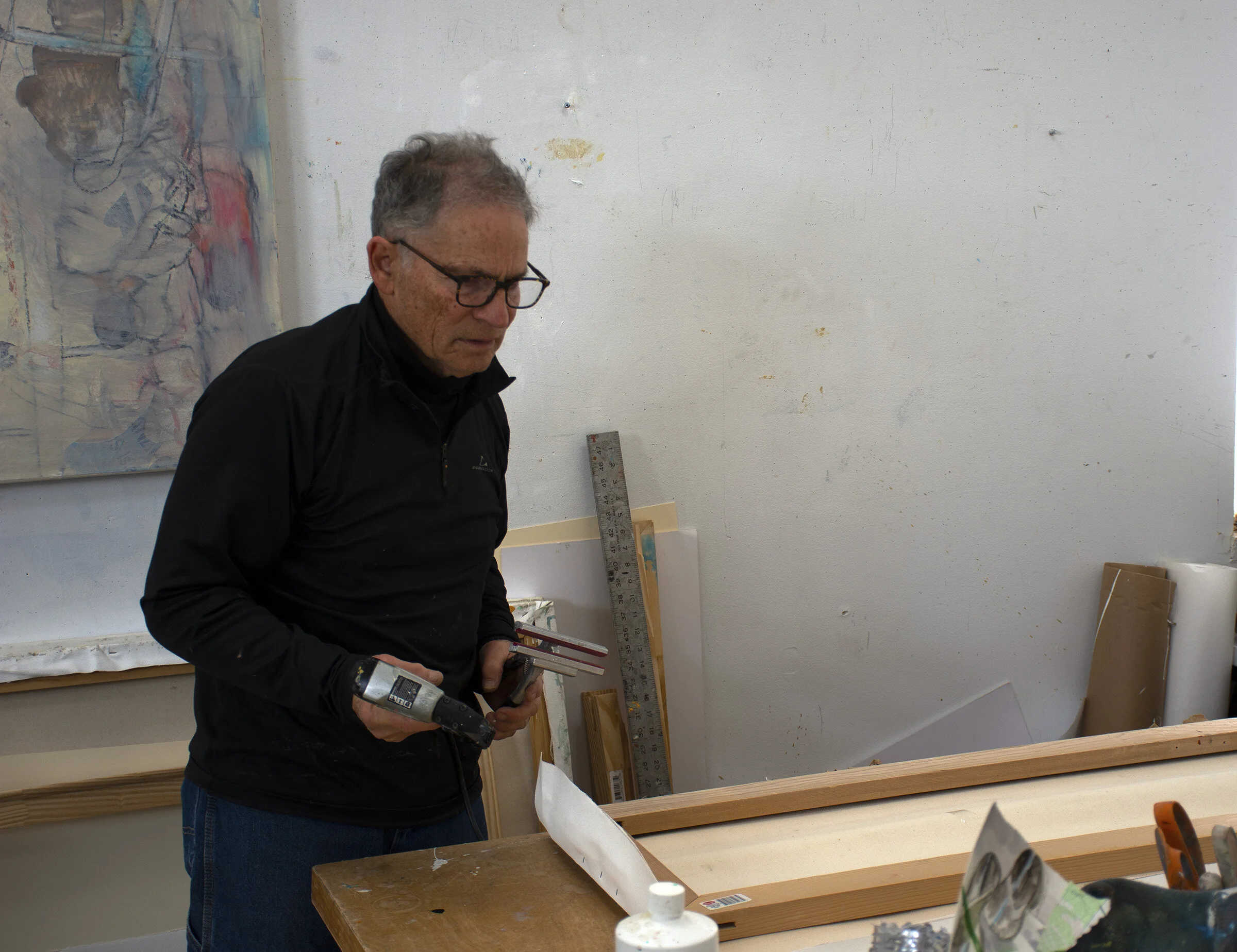 3:13 PM: i stretched a 66x16” canvas and prepared to stretch 2 more squarish ones. i was going back & forth about un-stretching a large yellow painting made over 3 years: singing creek. it’s 38 x 78” and i just couldn’t bring myself to un-stretch it & roll it up, likely not to be seen again for years. so, with some difficulty because it’s pretty heavy, i hung it on the wall adjacent to the stairs leading up to my loft area.