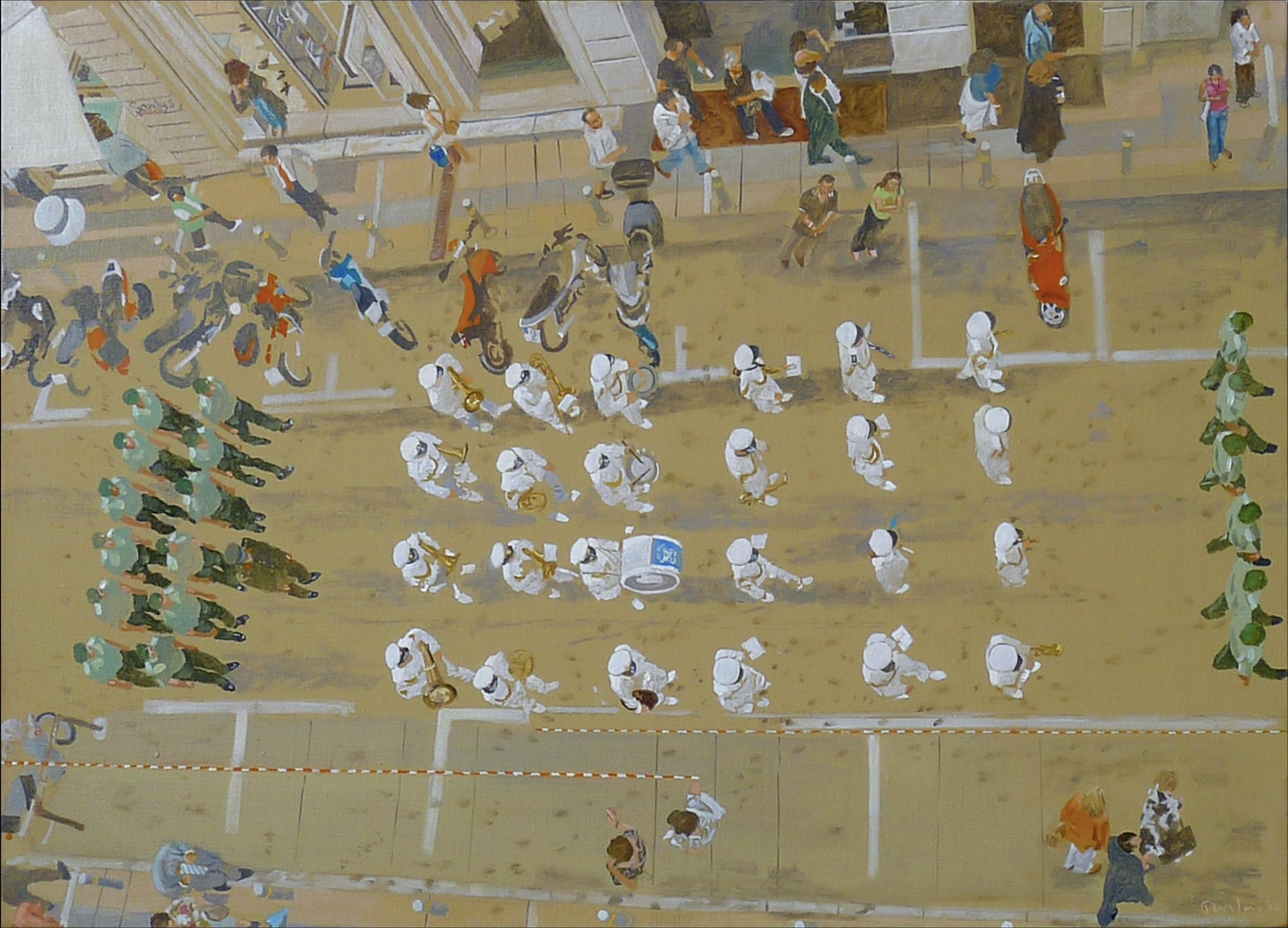 the figure on the left, which is so far the only one to have been painted in oil, is from one of the original series of photos i shot for the first ano kato paintings. (click painting series in the drop down menu above, then go to ano kato) he’s one of the figures on the sidewalk of skoufa street in athens, where there was a parade i photographed and painted. and that was the first in the ano kato series.