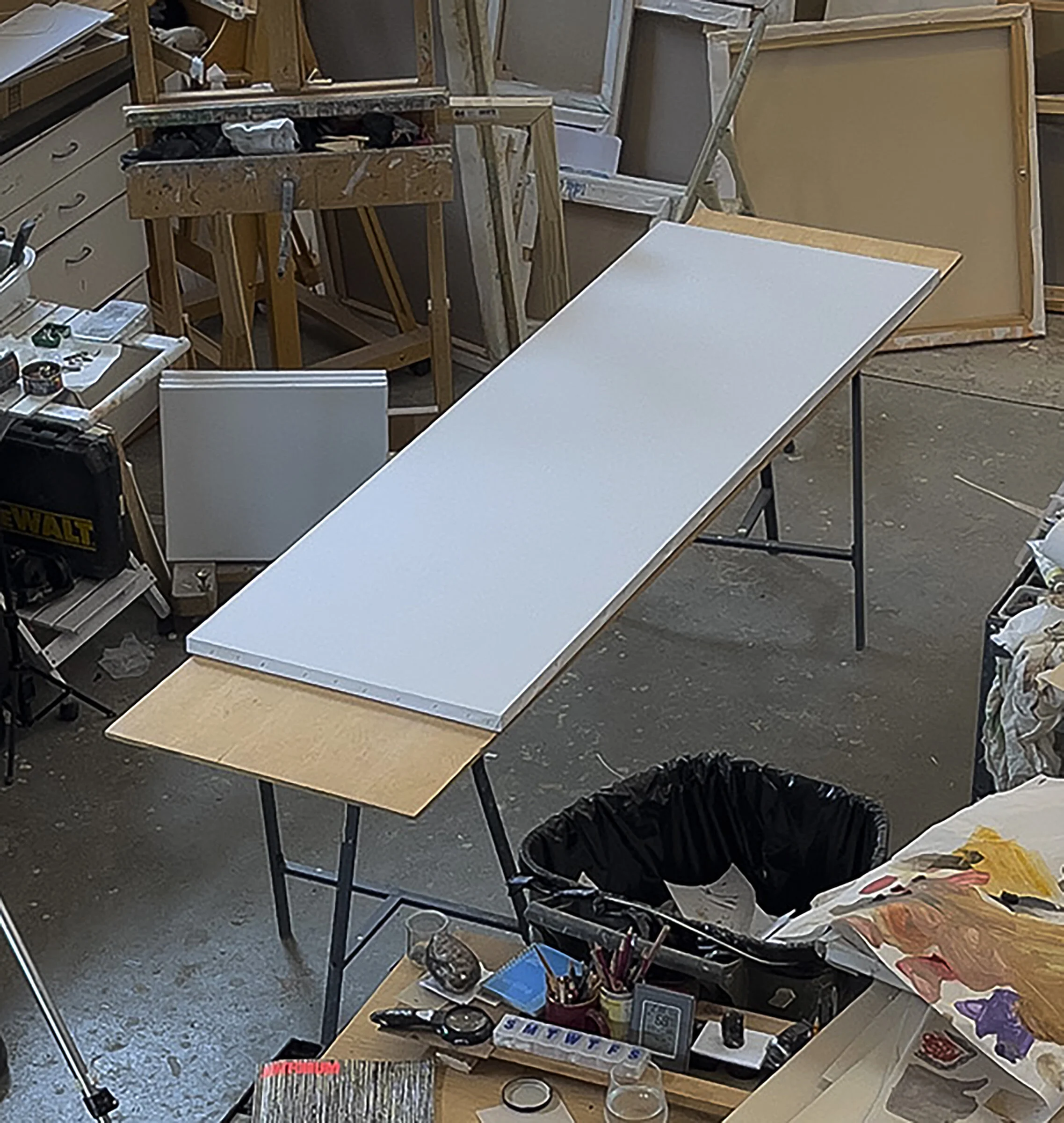 12:46 PM: i was able to get out the ripples in the canvas by removing some staples & re-stretching those areas. so i’m ready to start painting. i’ll update later this afternoon. we got a little wet snow last night; maybe 1/4 to 1/2”…not much but every little bit counts, to keep us out of extreme drought.
