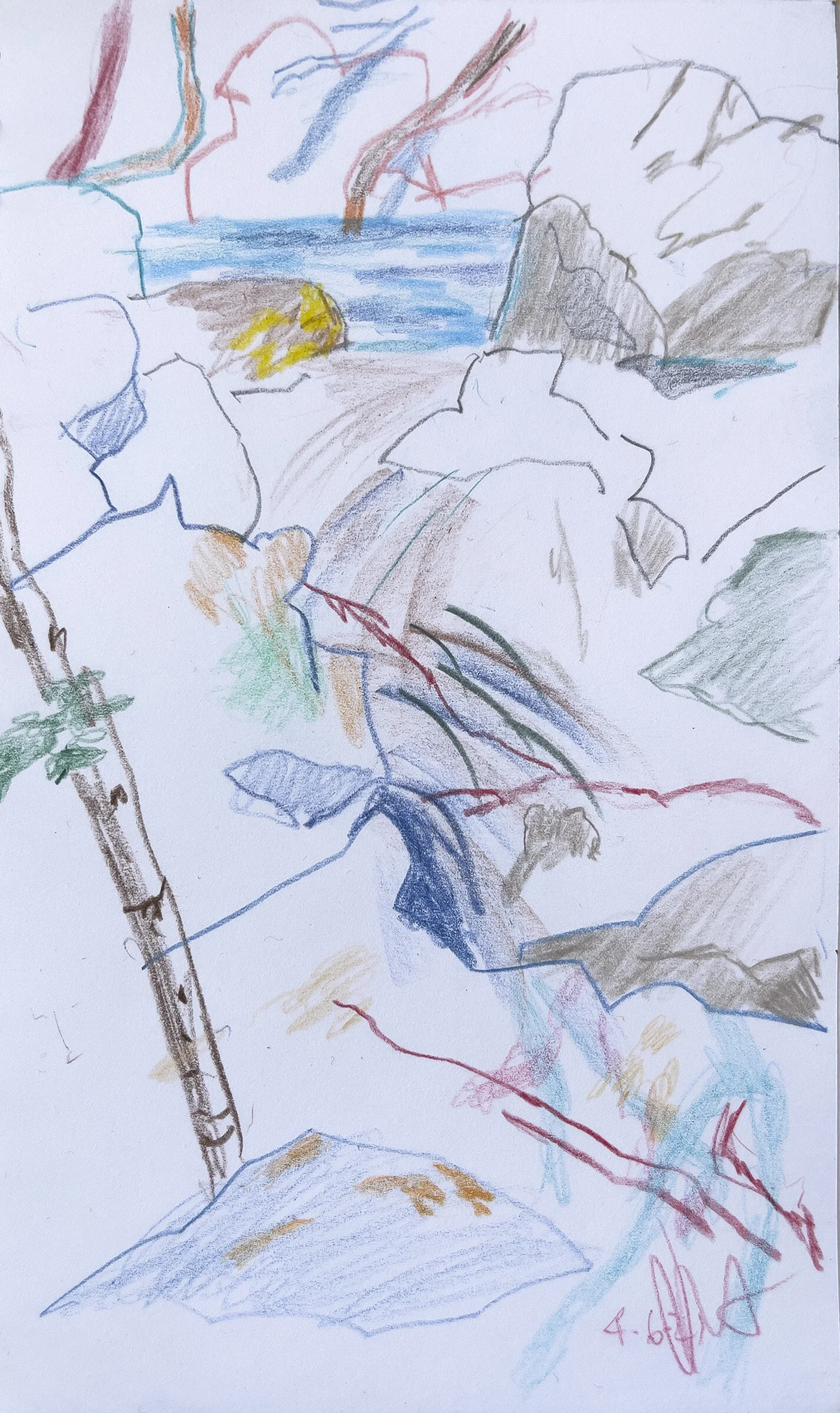 8:39 AM:on our walk up cottonwood trail yesterday we witnessed a striking richness of colors. we stopped a few times sothat i could take some shots with my phone, and one longer stop so that i could make a drawing, which i completed this morning, moments ago.