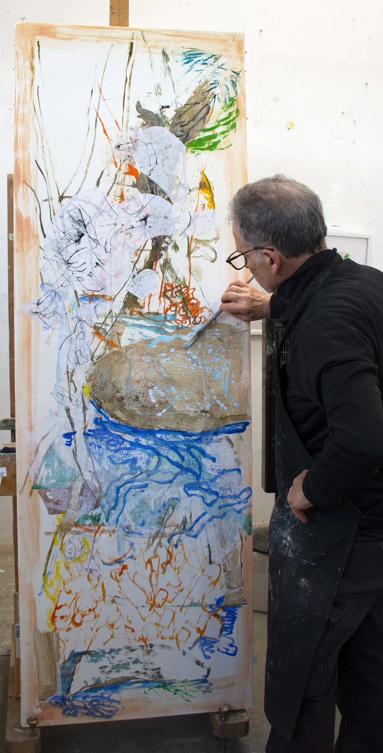 1:35 PM: i continued work on 5/30/21 creek oil, flipping it 360, yet again. a big rock has entered the composition, as well as collaged pieces of a cut up ink drawing i made this morning. the blue ripples in the creek water are always an opportunity for me to make the wavy, painterly marks that permeate my recent work. the pale pink border frames the entire composition, giving the eye edges to bounce off of and containing the multi-directional movement. a piece of bubble wrap pressed into the blues beneath the rock creates the illusion of, yes, bubbles!
