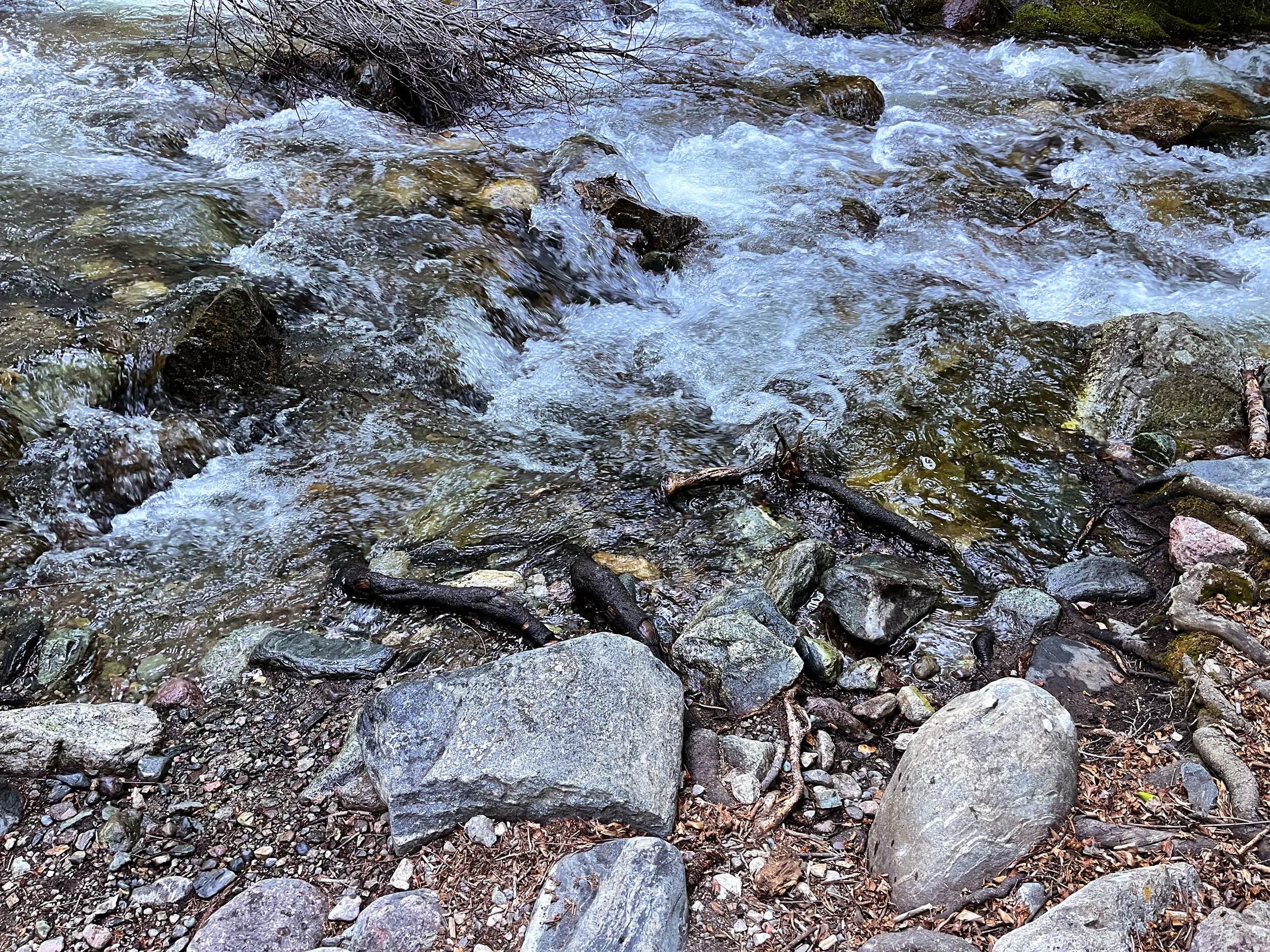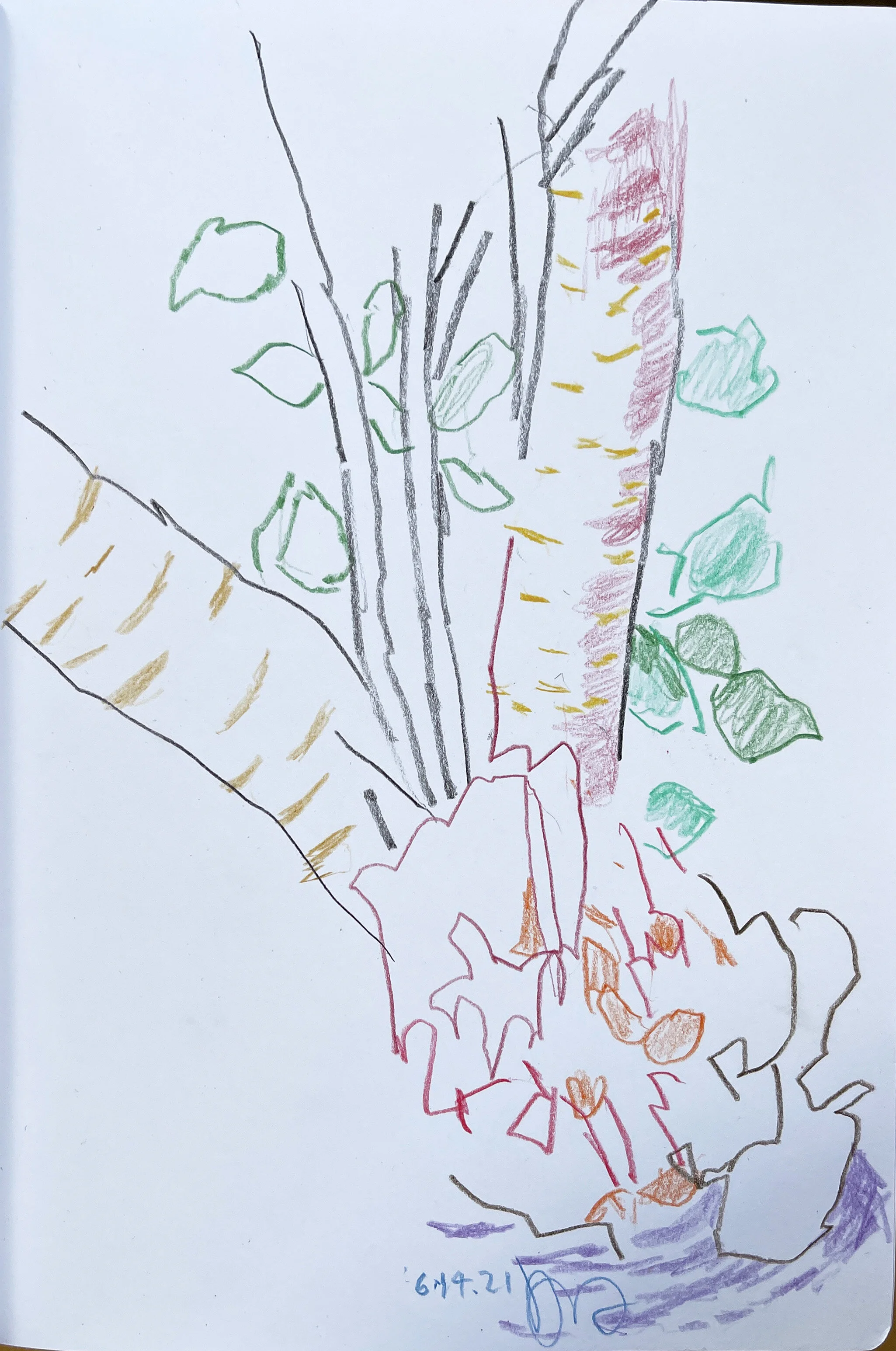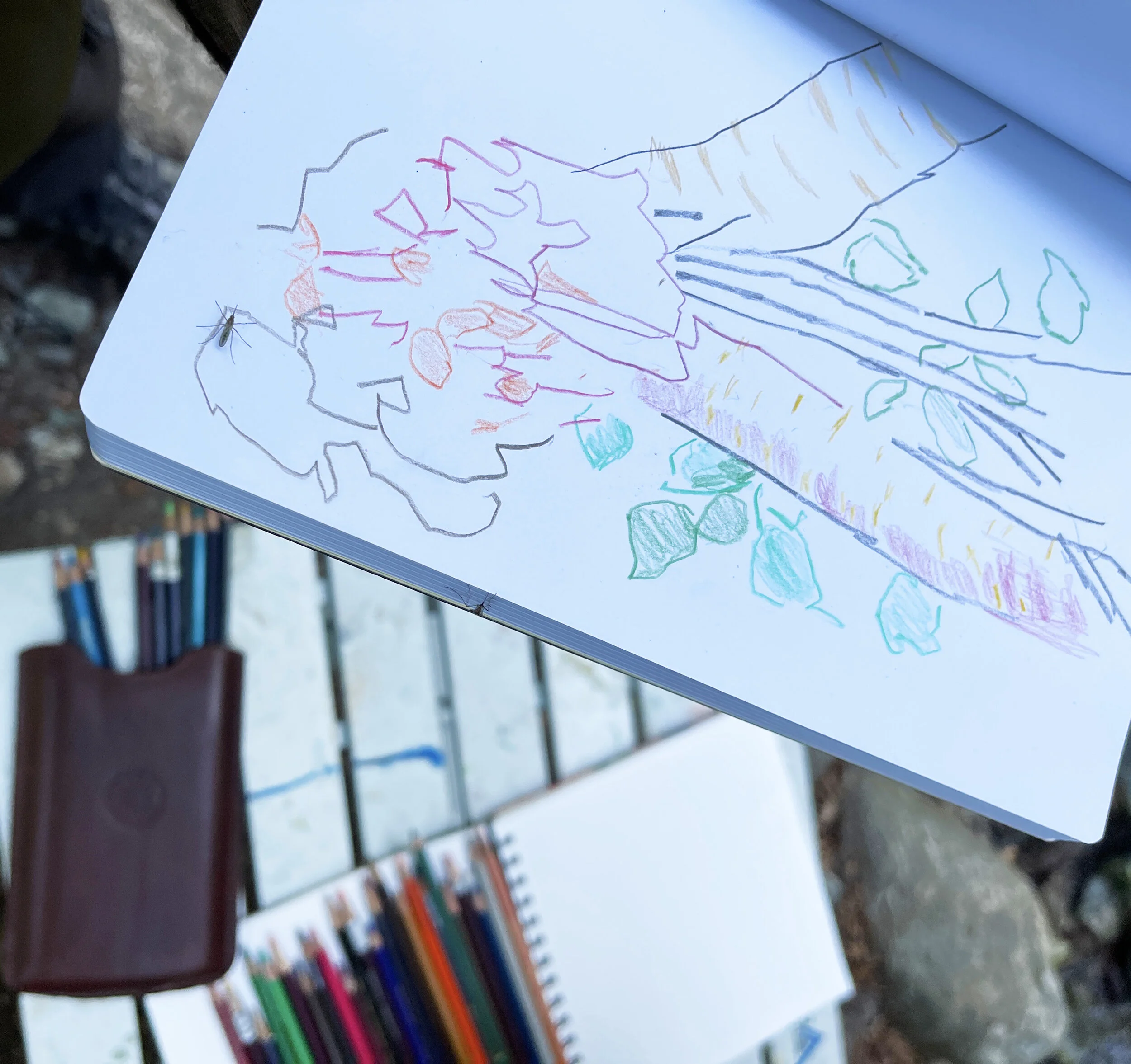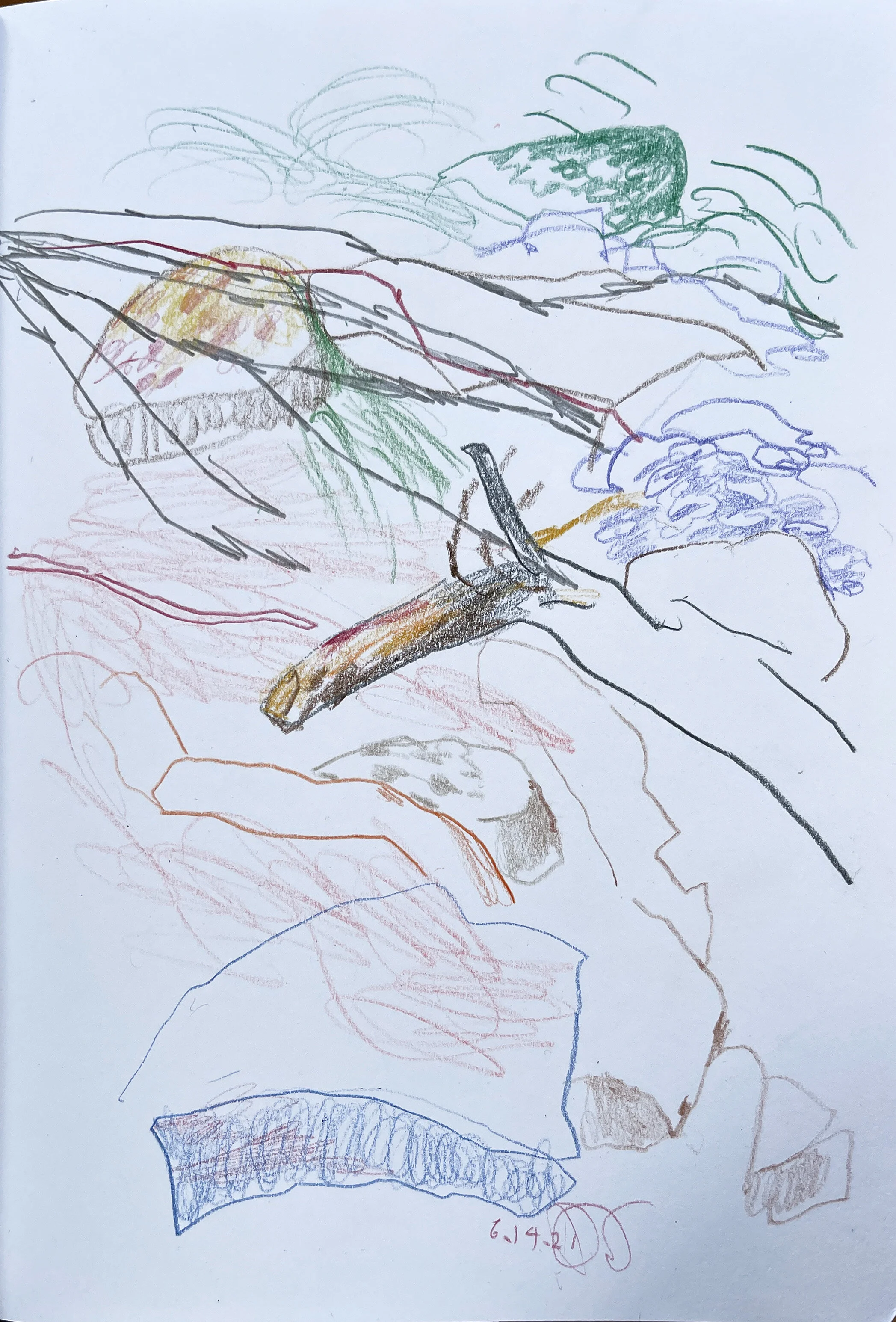 11:28 AM: this morning at 6:45am we set off for the creek. i’m not going up the trail with mikela until my groin strain healing process is further along. so I stayed down at the stupa trailhead, where there’s an ideal place to stand and make colored pencil drawings. we’re both wearing our mosquito netting jackets during this, the heart of mosquito season, and I took a photo of one of them that landed on my drawing. it’s kind of a drag, but you get used to it. and, even though we’re experiencing a heat wave this week, at that early hour the temperature is a perfect 55-60F.