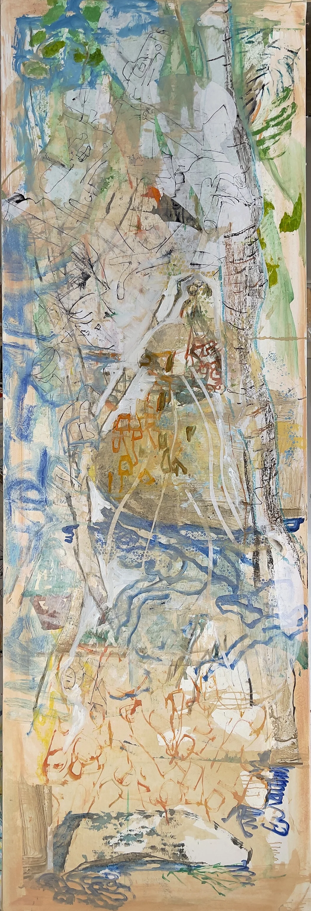 mikela wandered over a while ago and had an issue with the new green up on top. so that’s mostly gone, replaced by collaged pieces of a pen drawing i made while eliminating the green. also new is the tree trunk on the right, which anchors the composition. in real life, it looks a lot less busy than in the photo, and it’s actually rather beautiful. no way could i do any more today, and besides i’m on the phone with apple support for the last hour, addressing an issue that came up when my printer didn’t recognize the latest OS, so i’m having to revert to the previous. HUGE pain in the ass!