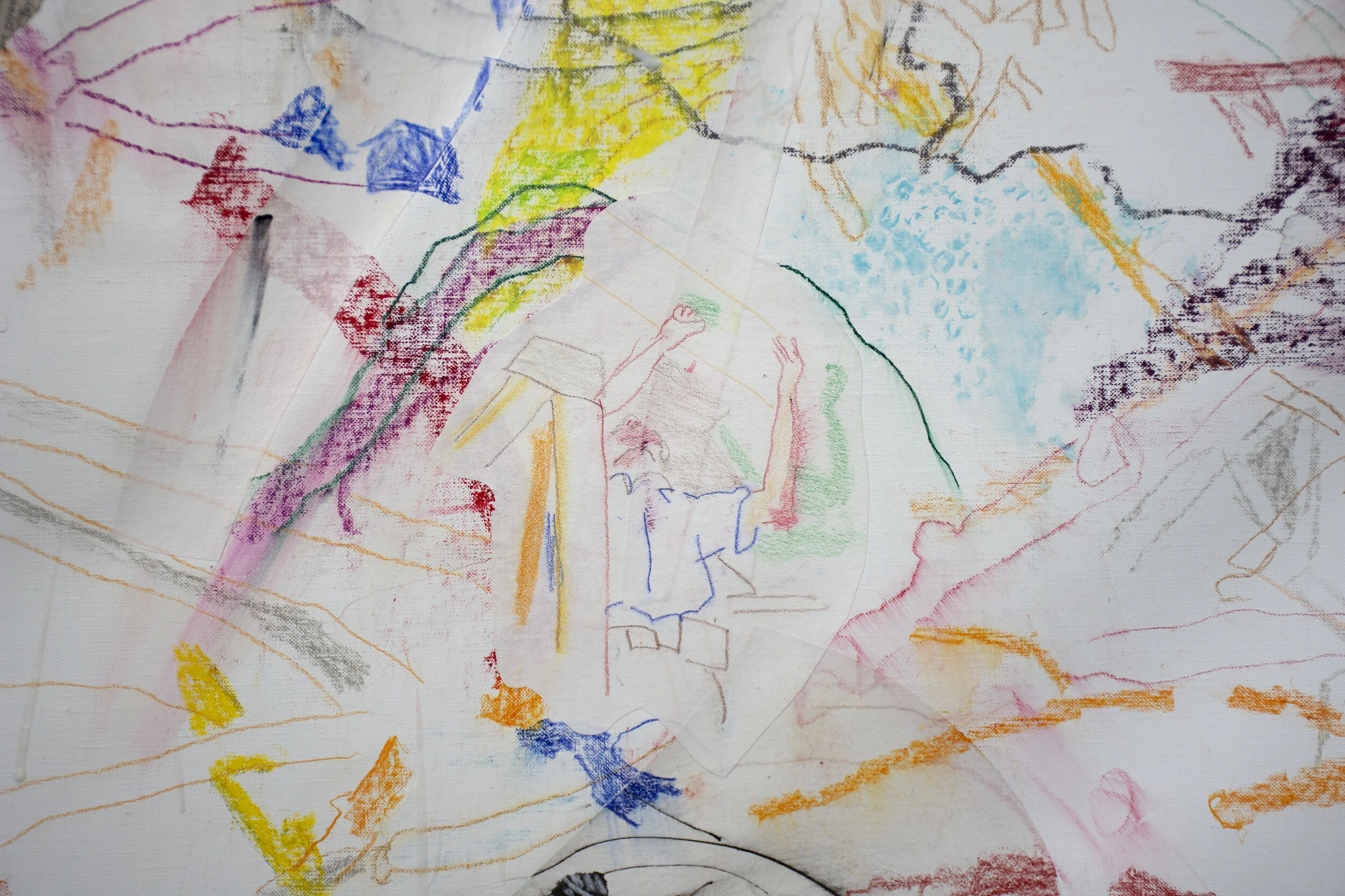 I continued drawing 6/24/2021 creek drawing/collage and collaged a few more areas. one of the collaged pieces of paper contains a quick drawing I made about half an hour ago, of our friend David installing new lights in our closet, which are much brighter than what we had previously.