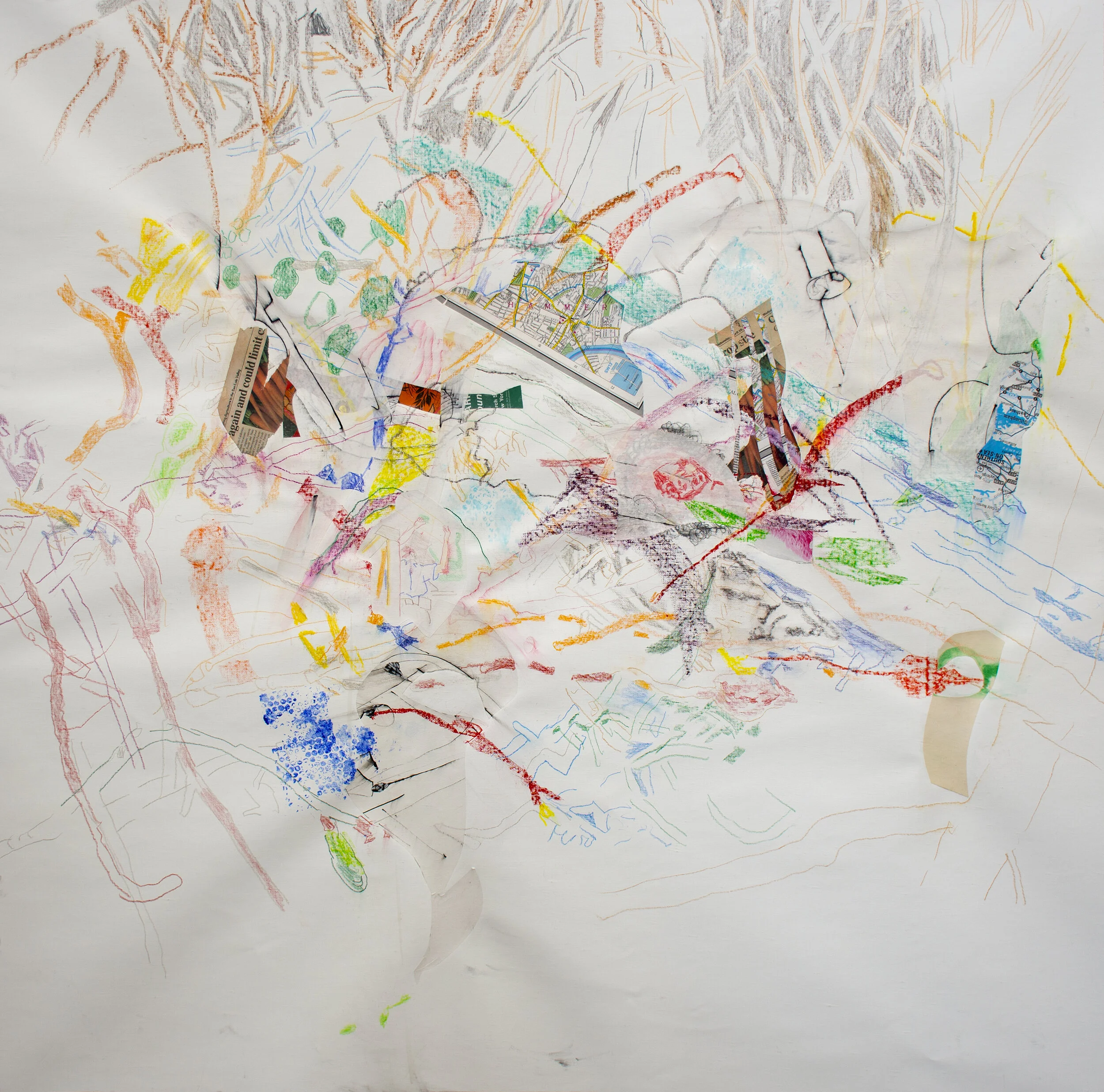 6/24/2021 creek drawing/collage. 49.5x49.5 in. at 1pm today